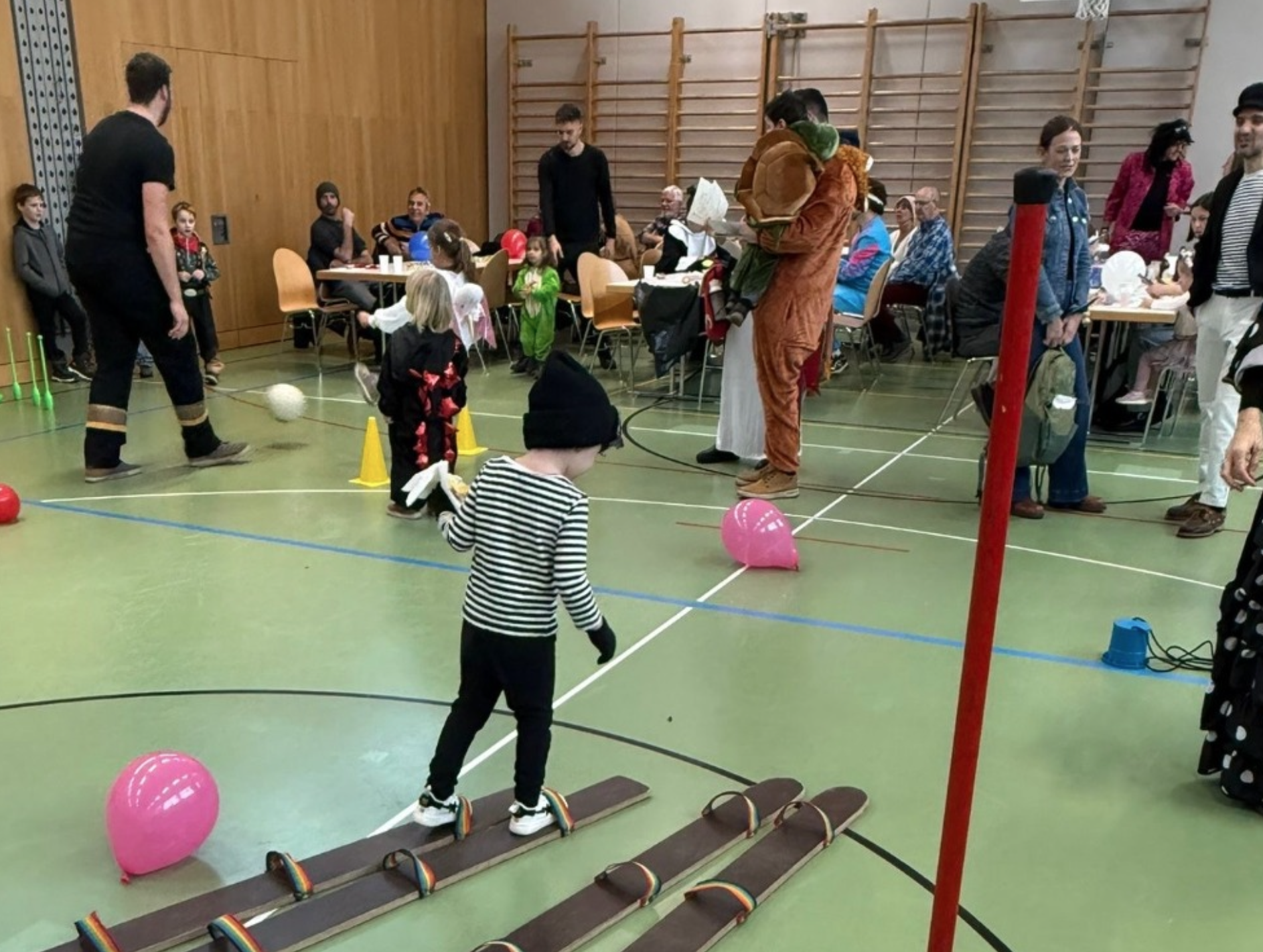 Anschliessend verwandelte sich die Turnhalle in eine lebendige Spielwelt. An verschiedenen Posten konnten sich die Kinder nach Herzenslust austoben und ihr Geschick unter Beweis stellen. Spiele wie Päcklifischen, Kegeln, Ballwerfen sowie verschiedene Balance-Spiele sorgten für viel Spass, Bewegung und Begeisterung. Auch der kreative Teil kam nicht zu kurz. Am Basteltisch durften die Kinder ihre eigenen Instrumente basteln, die anschliessend bunt bemalt und dekoriert wurden. Ein weiteres Highlight war das Kinderschminken, bei dem die Gesichter mit fantasievollen Motiven und leuchtenden Farben verwandelt wurden.