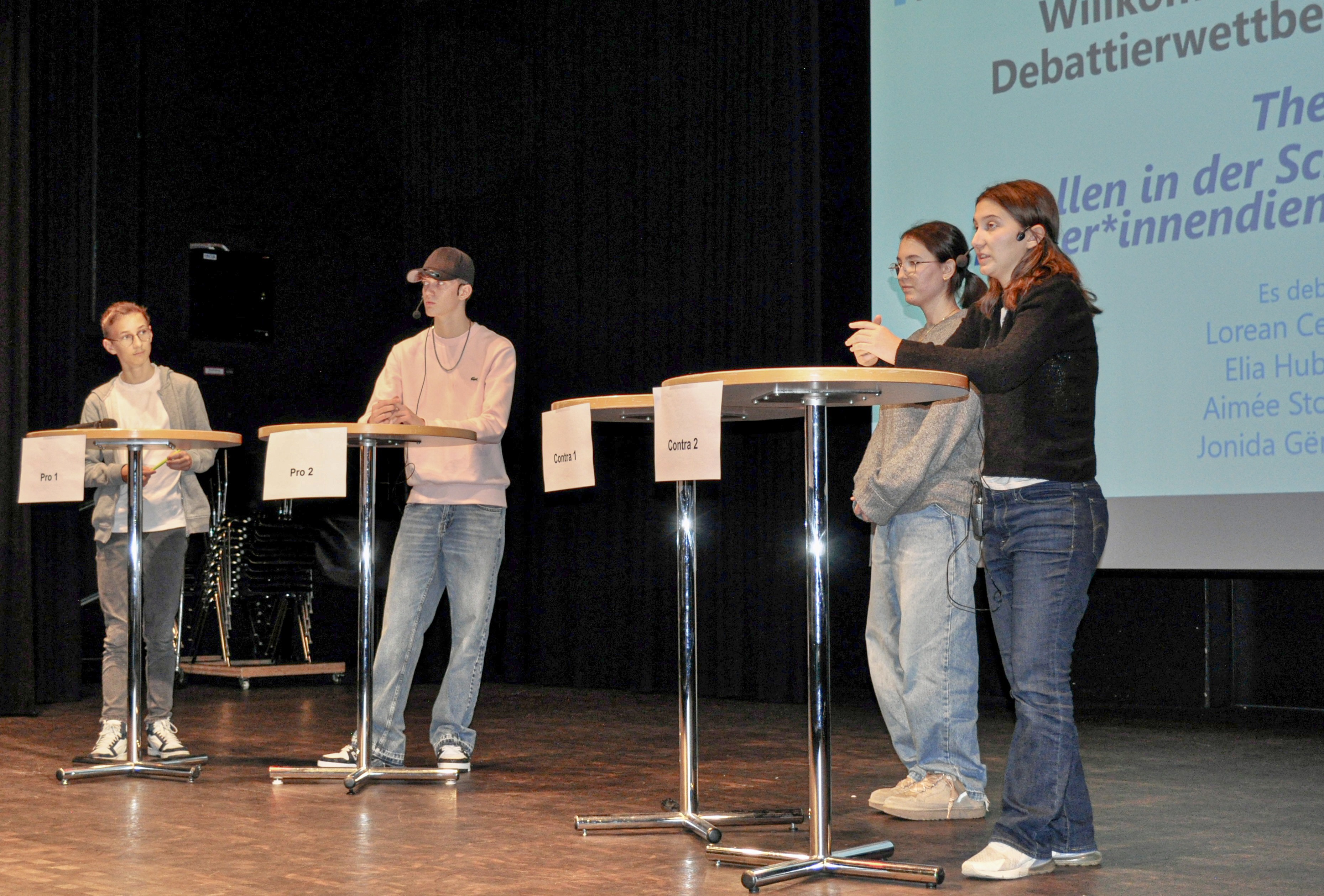 Lorean Celiku, Jonida Gërvalla, Elia Huber und Aimée Stocker waren zuvor im klasseninternen Kräftemessen mit Argumenten zu anderen Fragen, etwa dem Stimmrechtsalter 16 oder der Problematik fleischähnlicher Bezeichnungen bei veganen Lebensmitteln, als Sieger erkoren worden. Für das schulinterne Finale aller Drittklässler schrieb YES ein Ablaufschema vor, dessen Einhaltung von Zeitwächtern kontrolliert wurde: Auf die vierminütige Eröffnungsrunde, bei der alle Teilnehmenden eine Minute Redezeit erhielten, folgte die freie Aussprache. Diese bildete den Hauptteil der Debatte. Die dafür vorgesehenen 10 Minuten waren am Schluss matchentscheidend. Denn hier erwies sich, wer von den vier Schülerinnen und Schülern die nächsthöhere Stufe erklimmt, das Regionalfinale an der Kanti Beromünster am 24. Januar 2026.