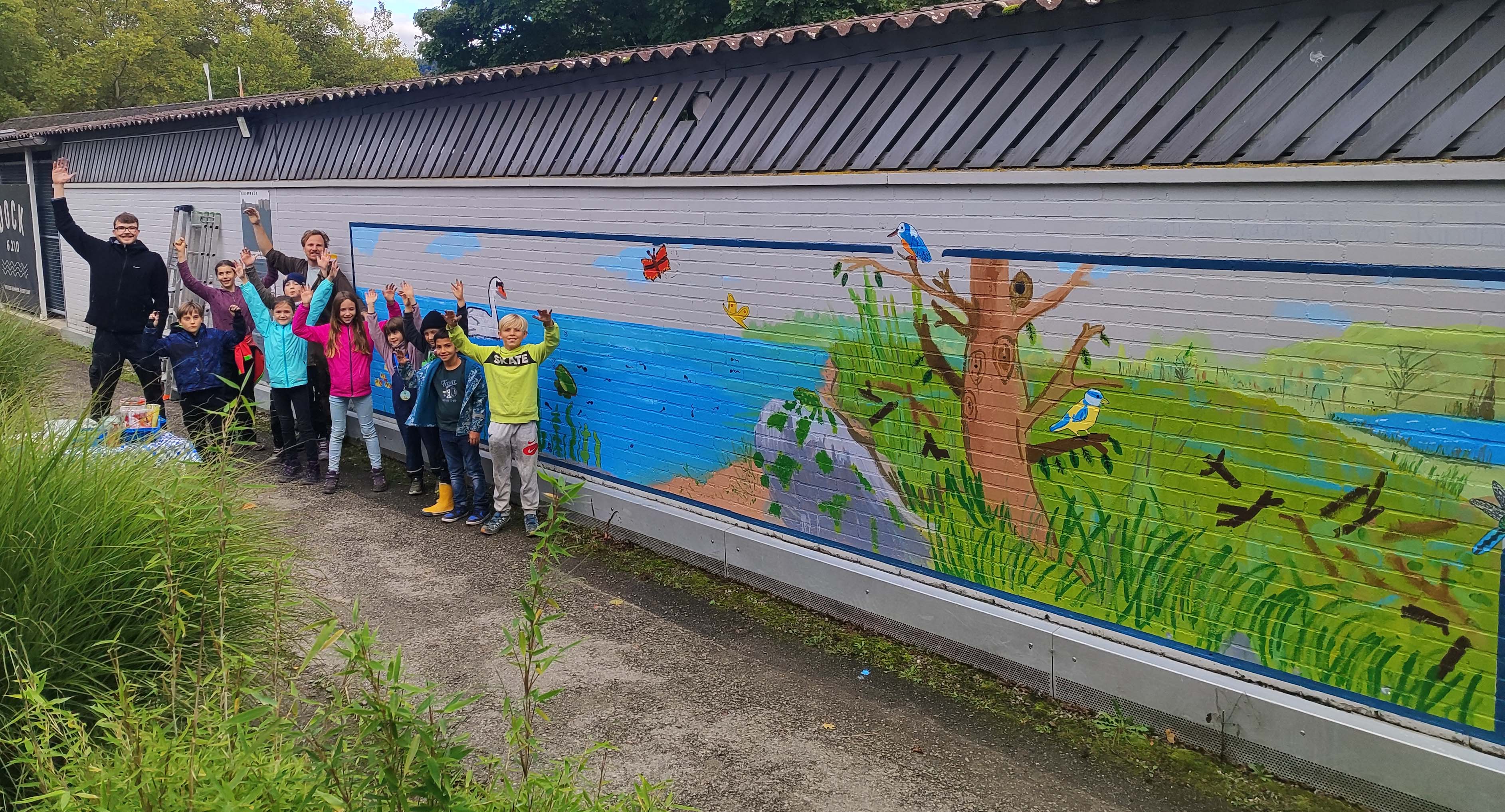 Beim ersten Zusammentreffen zwei Wochen zuvor skizzierten die Kinder im Alter zwischen acht und zehn Jahren verschiedene Tiere, die in der Region heimisch sind. Dabei lernten sie die Bedeutung des genauen Beobachtens der Anatomie beim Zeichnen. Am vergangenen Samstag wurden die Skizzen in die Tat umgesetzt. Die jungen Künstlerinnen und Künstler malten die Tiere auf die Wand gegenüber dem Piratenspielplatz. Das fertige Wandbild zeigt eine belebte Seelandschaft, die mit Blick aus der richtigen Perspektive mit der Umgebung vor Ort verschmilzt.
