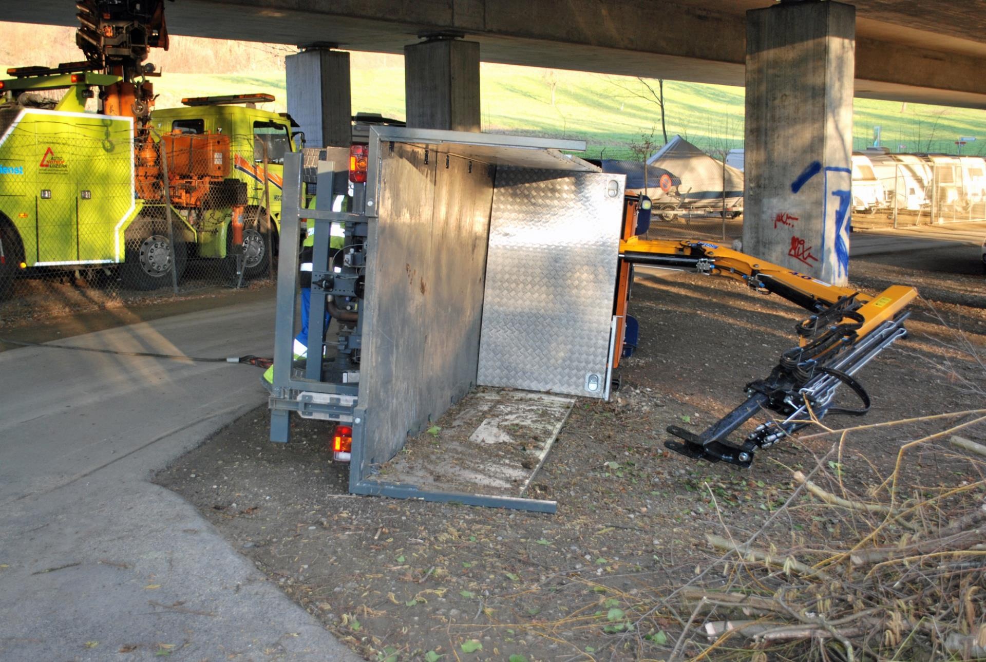 Weil ein Greifarm zu wenig eingezogen war, blieb ein Kommunalfahrzeug an einer Autobahnbrücke in Schenkon hängen und kippte um. An der Brücke waren lediglich Kratzspuren sichtbar, teilt die Luzerner Polizei mit.