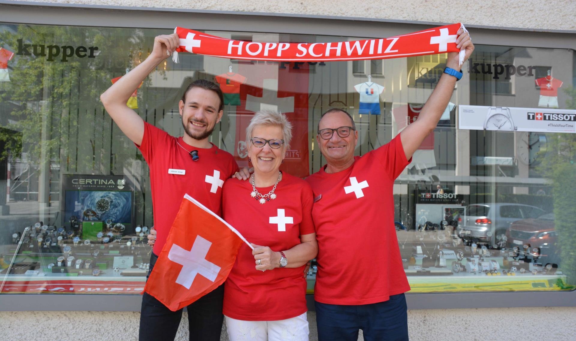 Die Schweiz spielt am Freitagabend um 20 Uhr gegen Serbien. Den ganzen Tag fiebert Elfi und Roland Kupper mit Mitarbeiter Adrian Lang von Kupper Uhren Bijouterie mit. Während der Arbeit tragen sie stolz die Fan-Shirts dieser Zeitung, was auch den Kunden gefällt. Super Kupper, können wir da nur sagen und drücken der Schweizer Nati ganz fest die Daumen.