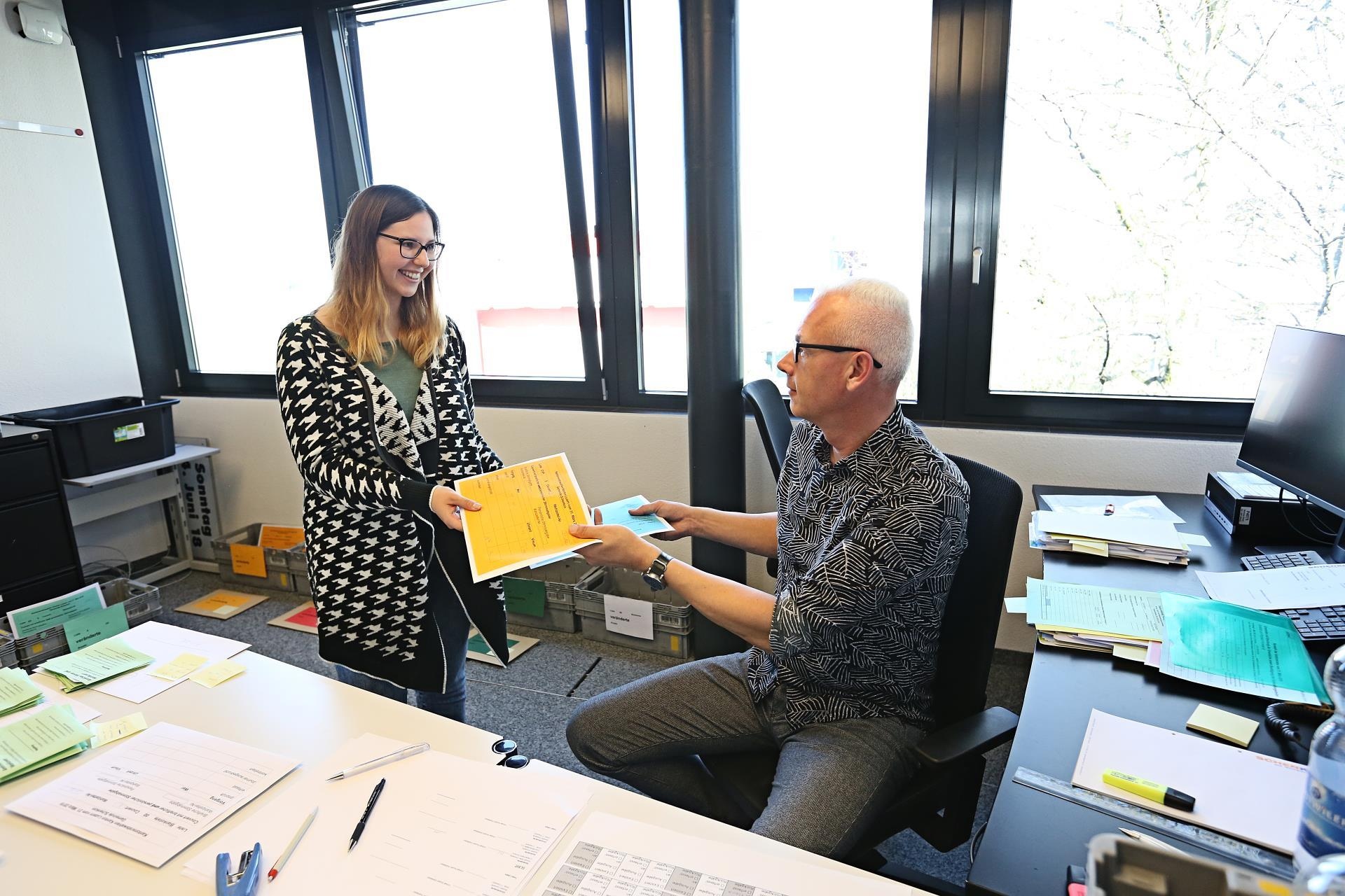Dreh- und Angelpunkt in Schenkon ist von Amtes wegen Gemeindeschreiber Reto Weibel, der auf dem Bild von der Kanzleiangestellten Nicole Müller ein Couvert mit ausgewerteten Wahlzetteln zurück erhält.