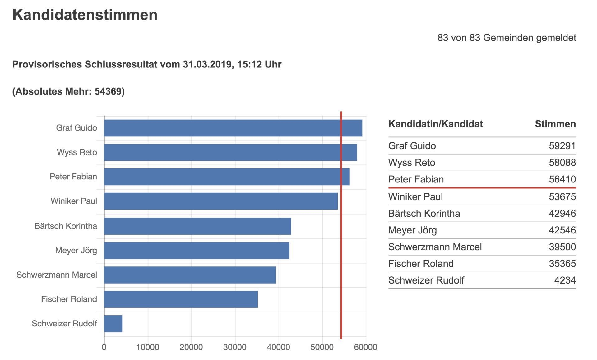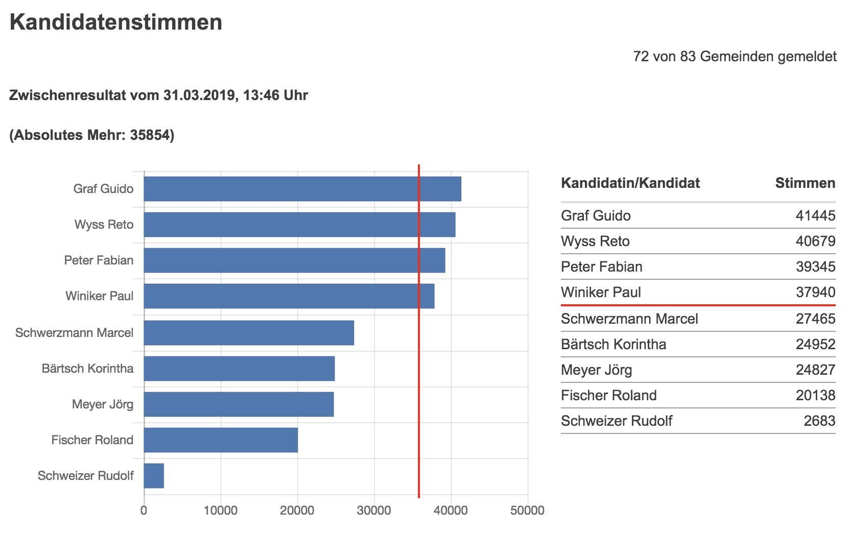 Die Regierungsratswahlen sind beendet. Guido Graf, Reto Wyss und Fabian Peter sind im ersten Wahlgang gewählt. Die Bisherigen Paul Winiker und Marcel Schwerzmann verpassen die Wiederwahl im ersten Wahlgang. Auf Platz 5 und 6 liegen Korintha Bärtsch und Jörg Meyer mit 400 Stimmen Unterschied.