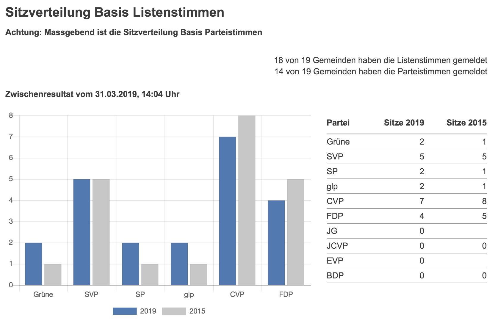 17 von 19 Basis-Listenstimmen sind ausgezählt. SP und Grüne stehen nach wie vor als Sitzgewinner da, Verliererin eines Sitzes wäre aktuell die CVP.