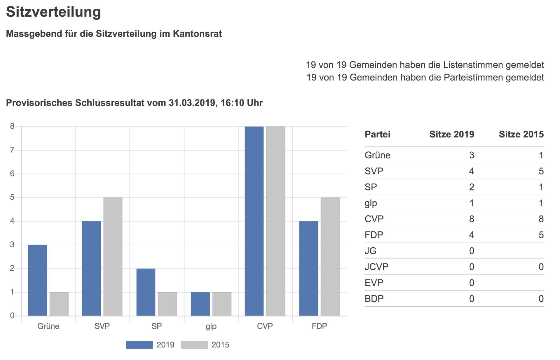 Was den Wähleranteil anbelangt, gehören die bürgerlichen Parteien zu den Verlieren im Wahlkreis. Die CVP büsst 2,75 Prozent Wähleranteil ein, die SVP 3,82 Prozent und die FDP 2,3 Prozent. Die SP legt um 0,66 Prozent zu, die Grünen um 3,48 Prozent, die GLP um 1,73 Prozent und die Jungen Grünen um 2,44 Prozent. Während die JCVP um 0,68 Prozent und die EVP um 0,78 Prozent zulegen, verliert die BDP 0,88 Prozent Wähleranteil.