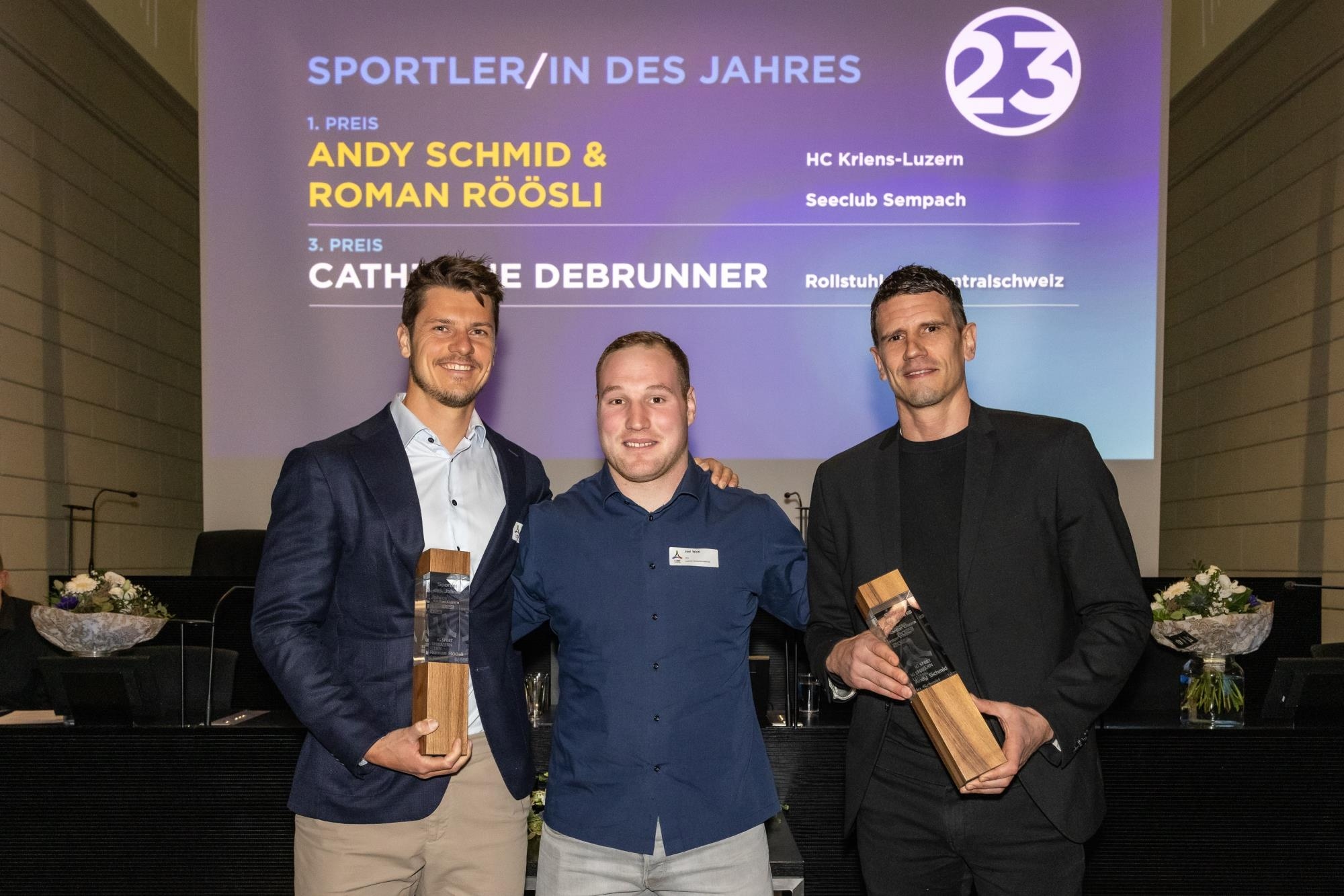 Der Kanton Luzern feierte am 28. Februar seine erfolgreichen Sportlerinnen und Sportler wie auch Funktionärinnen und Funktionäre des Jahres 2023 im Kantonsratssaal Luzern. Auf Einladung der IG Sport Luzern und des Kantons Luzern fanden sich über 130 Besuchende ein, um die herausragenden Leistungen im und für den Luzerner Sport zu würdigen. Der Luzerner Sportpreis ging heuer an zwei Sportler, die sich den Titel teilen: Roman Röösli, überzeugte die Jury mit den beiden Goldmedaillen, die er 2023 in der Bootsklasse Zweier ohne Steuermann (zusammen mit Andrin Gulich) sowohl von den Europameisterschaften im slowenischen Bled als auch drei Monate später von den Weltmeisterschaften in Belgrad, Serbien, nach Hause brachte. Röösli telt sich den Titel «Luzerner Sportler des Jahres 2023» mit dem ehemaligen Handballspieler Andy Schmid, der im Januar 2024 sein Karriereende bekanntgegeben und vor wenigen Wochen das Traineramt der Schweizer Nationalmannschaft übernommen hat. Für seine beeindruckende internationale Karriere wurde Andy Schmid zusätzlich mit dem Special Award ausgezeichnet. Überreicht wurde ihm dieser von Regierungsrätin Michaela Tschuor und Sportmediziner Dr. Daniel Wegmann, der die Höchstleistungen des Handballstars in einer feierlichen Laudatio vorgängig resümierte.