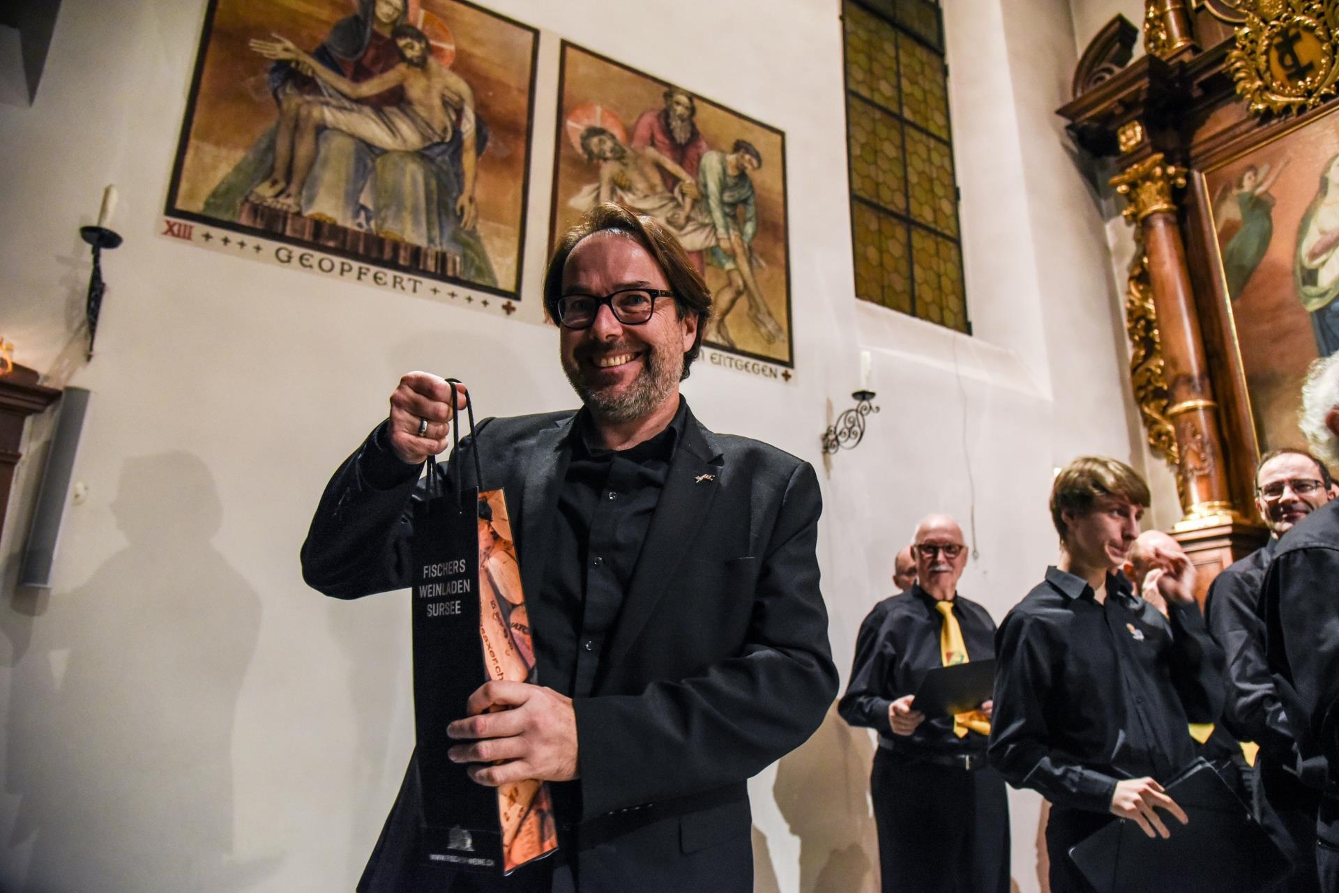 Dirigent Andreas Wiedmer hatte sich die Flasche Wein nach der Leitung der beiden Chöre mehr als verdient. (Foto Manuel Arnold)
