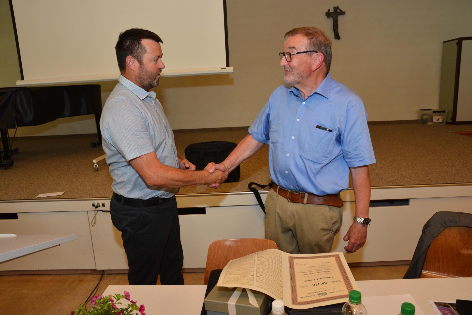 Nicht immer sei der Umgang mit den eidgenössischen Ämtern und dem Kanton einfach gewesen, gab der Laudator zu bedenken. «Urs Muther umschiffte jedoch auch diese Klippen gekonnt. Und beim Umgang mit den Gemeindevertretern bewies er immer viel Gespür.» Martin Ulrich überreichte Urs Muther, welcher der Bahn als Präsident des Vereins ST Historic erhalten bleibt, als Dank für das Geleistete unter anderem eine (historische) ST-Aktie.