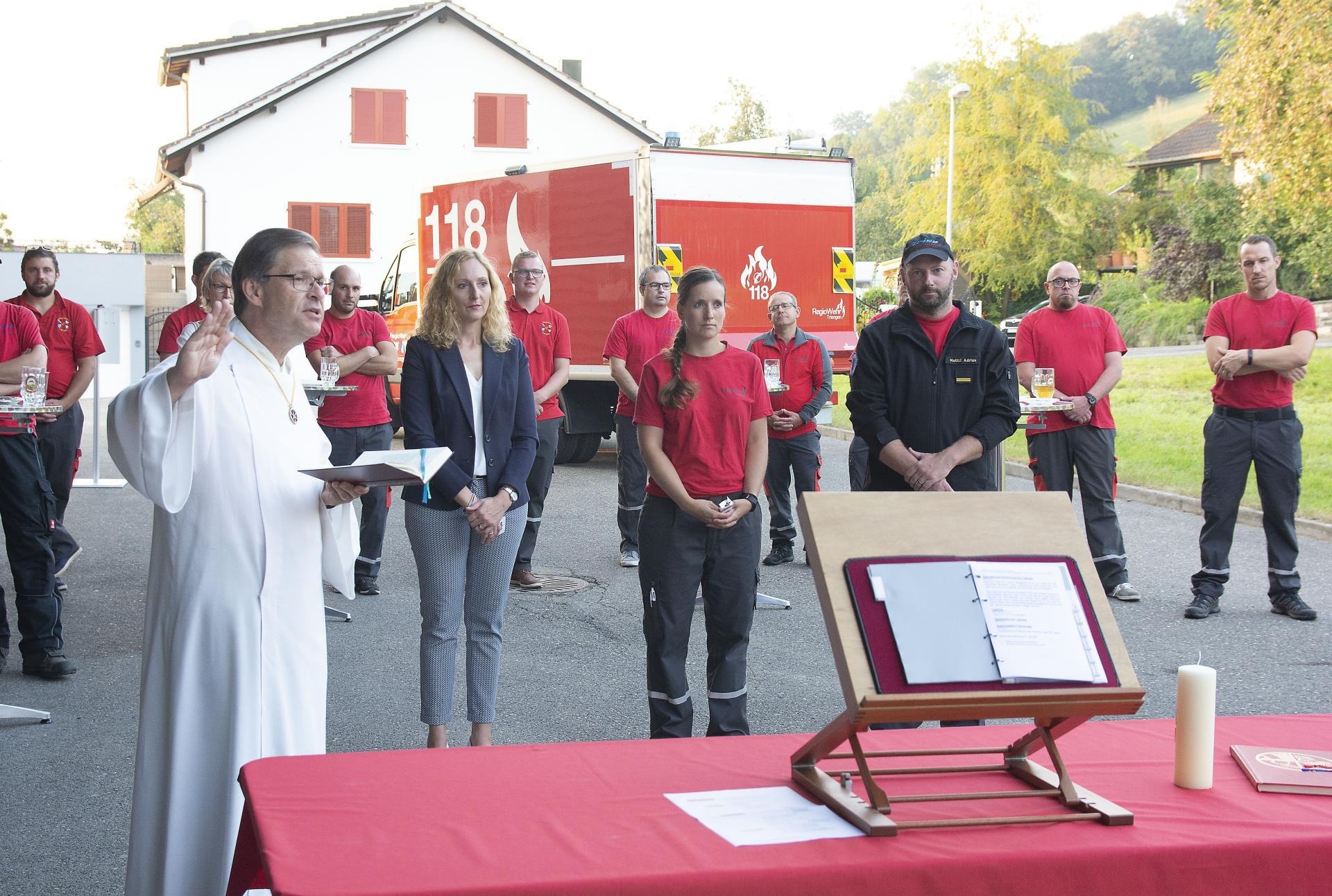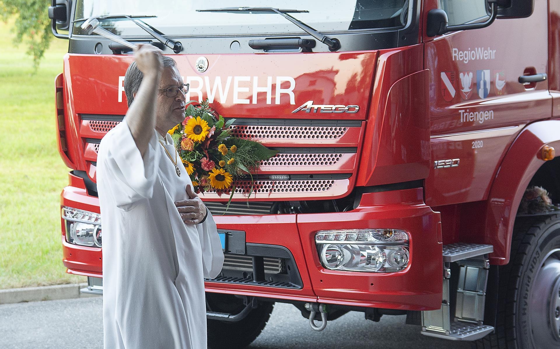 Pastoralraumleiter Roland Bucher führte danach die Segnung durch. «Menschen können viel machen, ihnen sind jedoch Grenzen gesetzt», sagte er mit Blick auf den Brand der Scheune an der Sure vom vergangenen Juli. Er überreichte den drei Fahrzeug-Paten je eine Figur des heiligen Christophorus, einer der 14 Nothelfer. «Ihr sorgt dafür, dass die Plaketten in den Fahrzeugen einen Platz findet», gab er ihnen mit. Er segnete die Fahrzeuge und alle Anwesenden. «Gegenstände sind nie losgelöst von Menschen», erklärte Roland Bucher dazu.