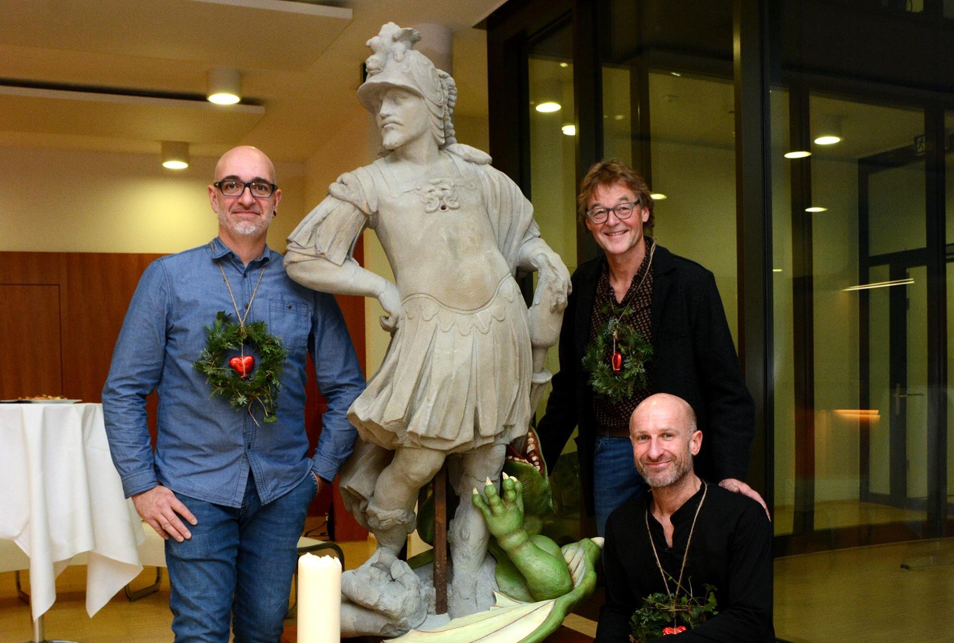 Im Mittelpunkt der Einweihung standen aber vor allem drei Männer: Bildhauer Alex Wicki, Holzbildhauer Roger Stalder und Metallgestalter Hanspeter Büchler, die sich vor rund zwei Jahren im Auftrag von Korporation und Stadt Sursee der Statue annahmen. Das Unterfangen erwies sich als Herausforderung: Die Statue musste stabilisiert, die Kniescheiben von früher eingemörtelten alten Steinmetzwerkzeugen befreit und das linke Bein rekonstruiert werden. Holzbildhauer Roger Stalder kümmerte sich um die Rekonstruktion des Drachens aus Holz und die Sockelverkleidung, während Metallgestalter Hanspeter Büchler eine Unterkonstruktion aus Metall anfertigte (diese Zeitung berichtete).