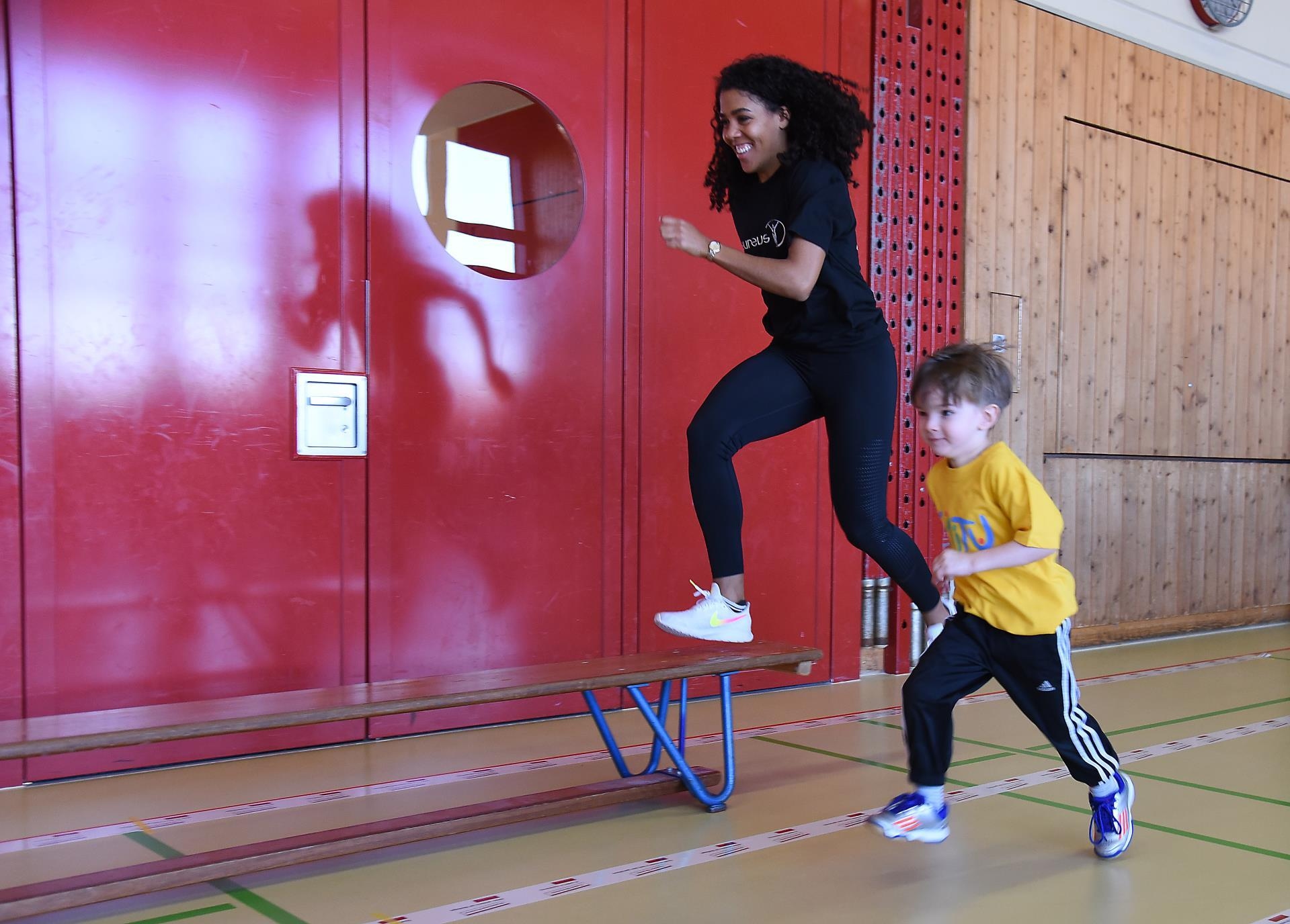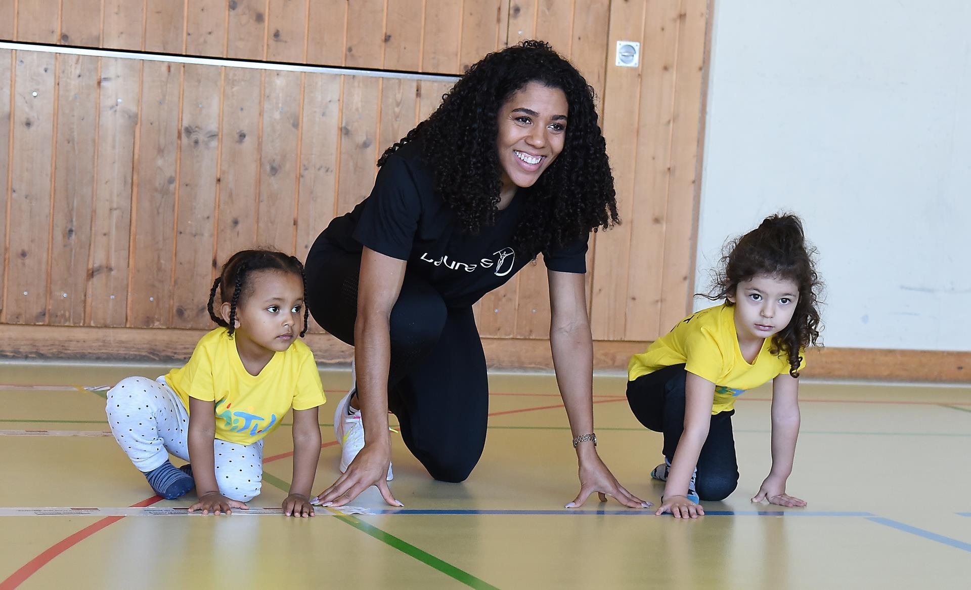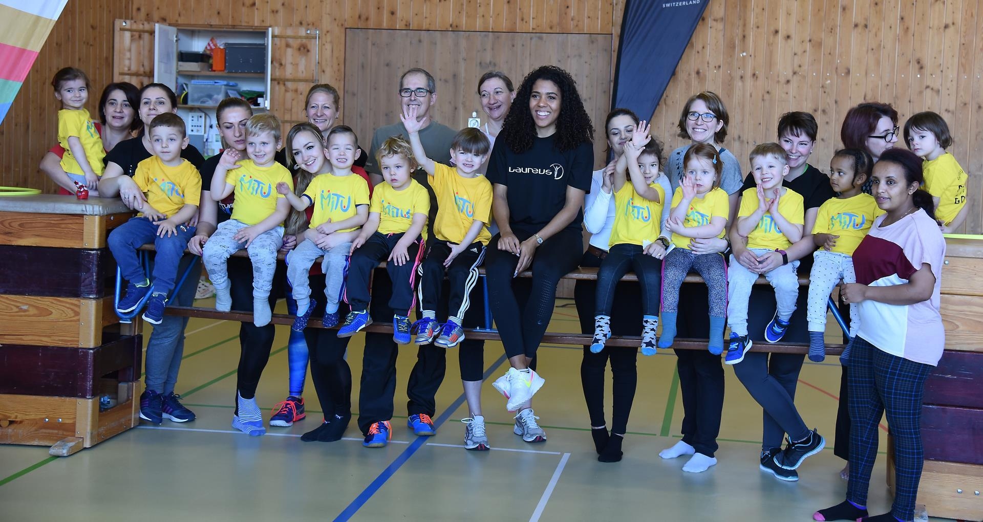 Natürlich wussten die sehr jungen Kinder nicht ganz, wer sie besuchte. Dennoch merkten sie schnell, dass ihr Gast besonders ist. Während der Turnlektionen – einen tollen Parcours durften sie absolvieren – wurden sie immer wieder fotografiert und gefilmt. Auch durften alle 13 Kinder mit Mamis und einem Papi ein gemeinsames Foto mit Mujinga Kambundji machen. Auch sprinteten sie am Schluss zusammen der Spitzensportlerin auf einer kurzen Strecke um die Wette.