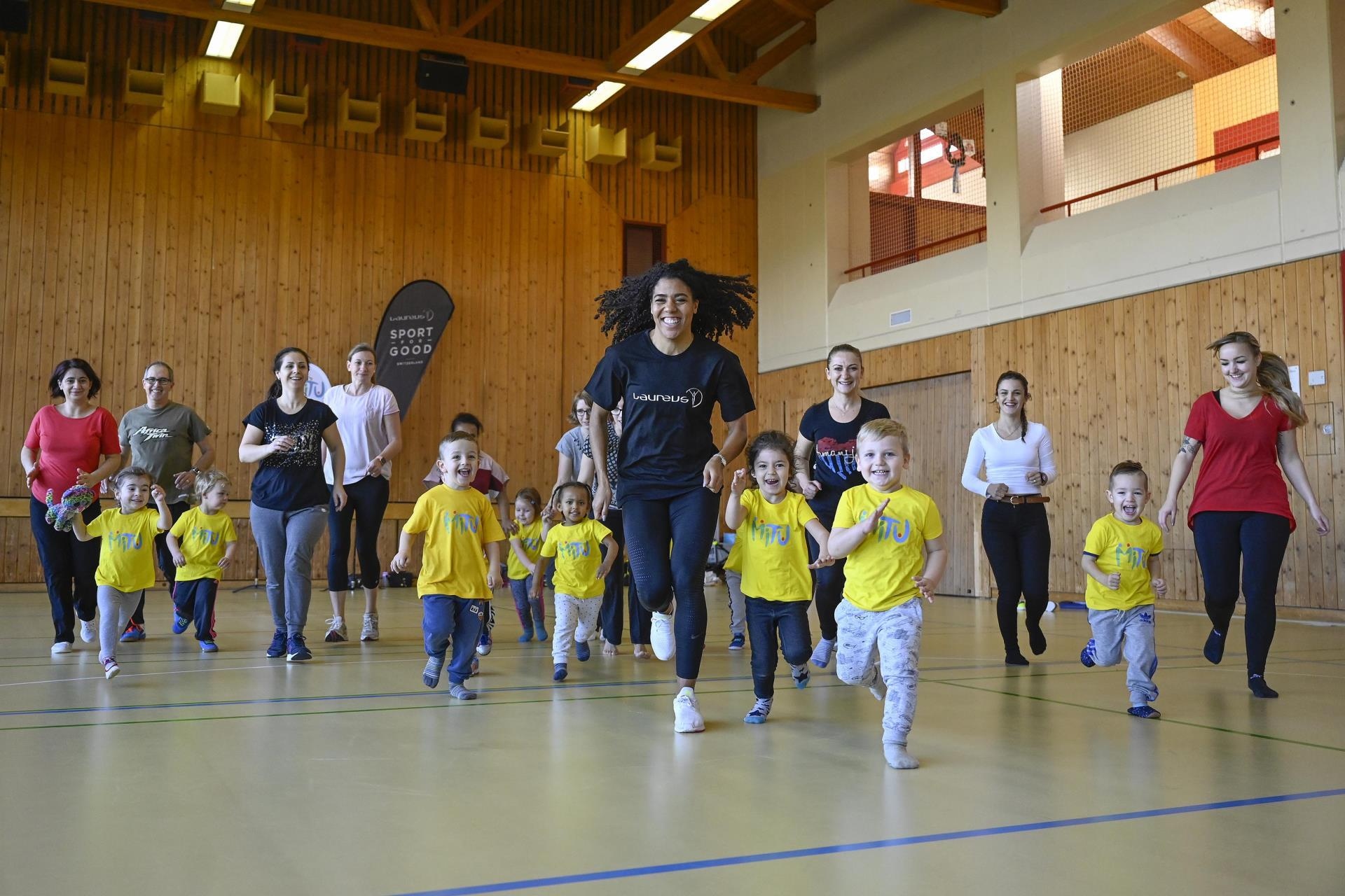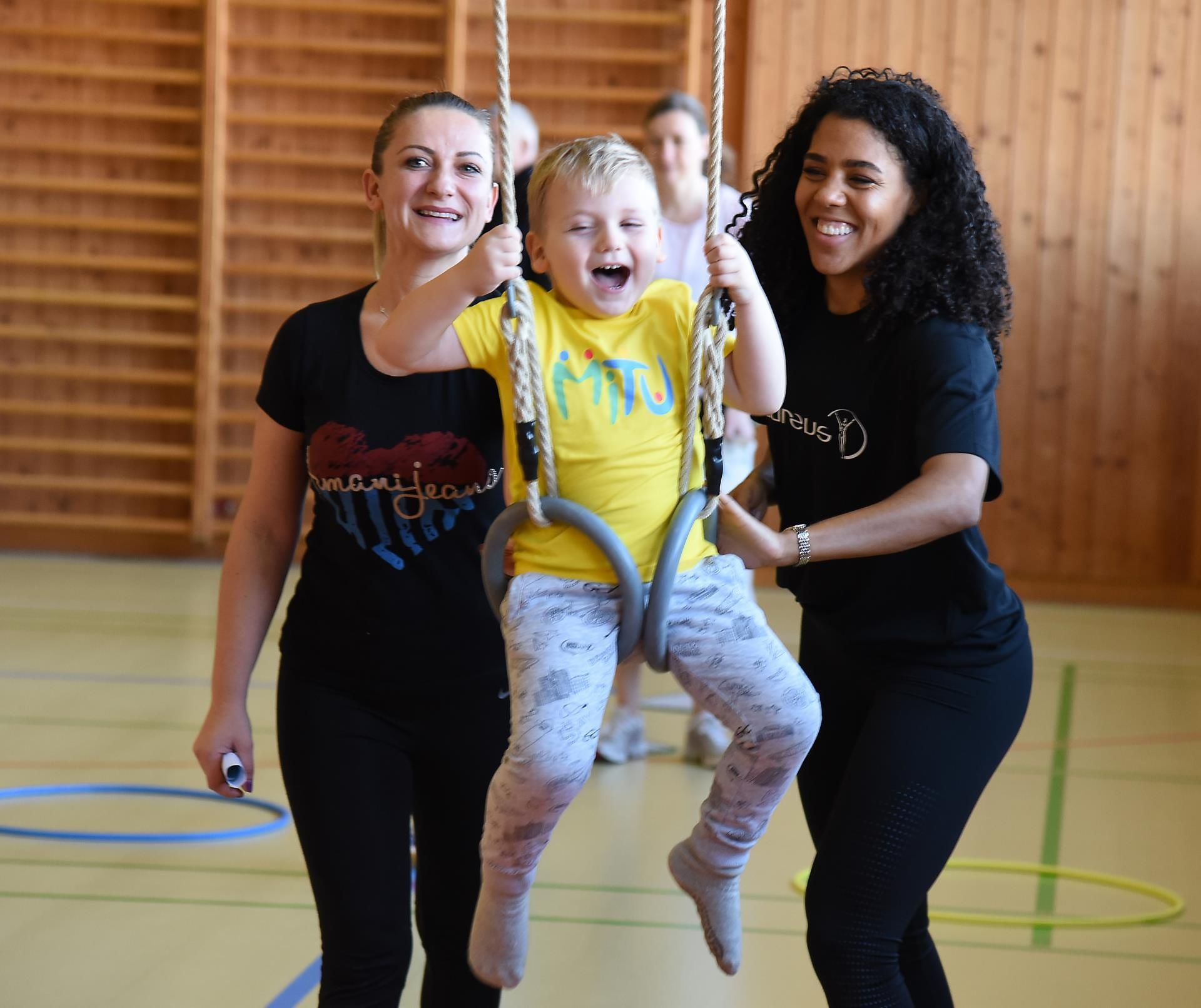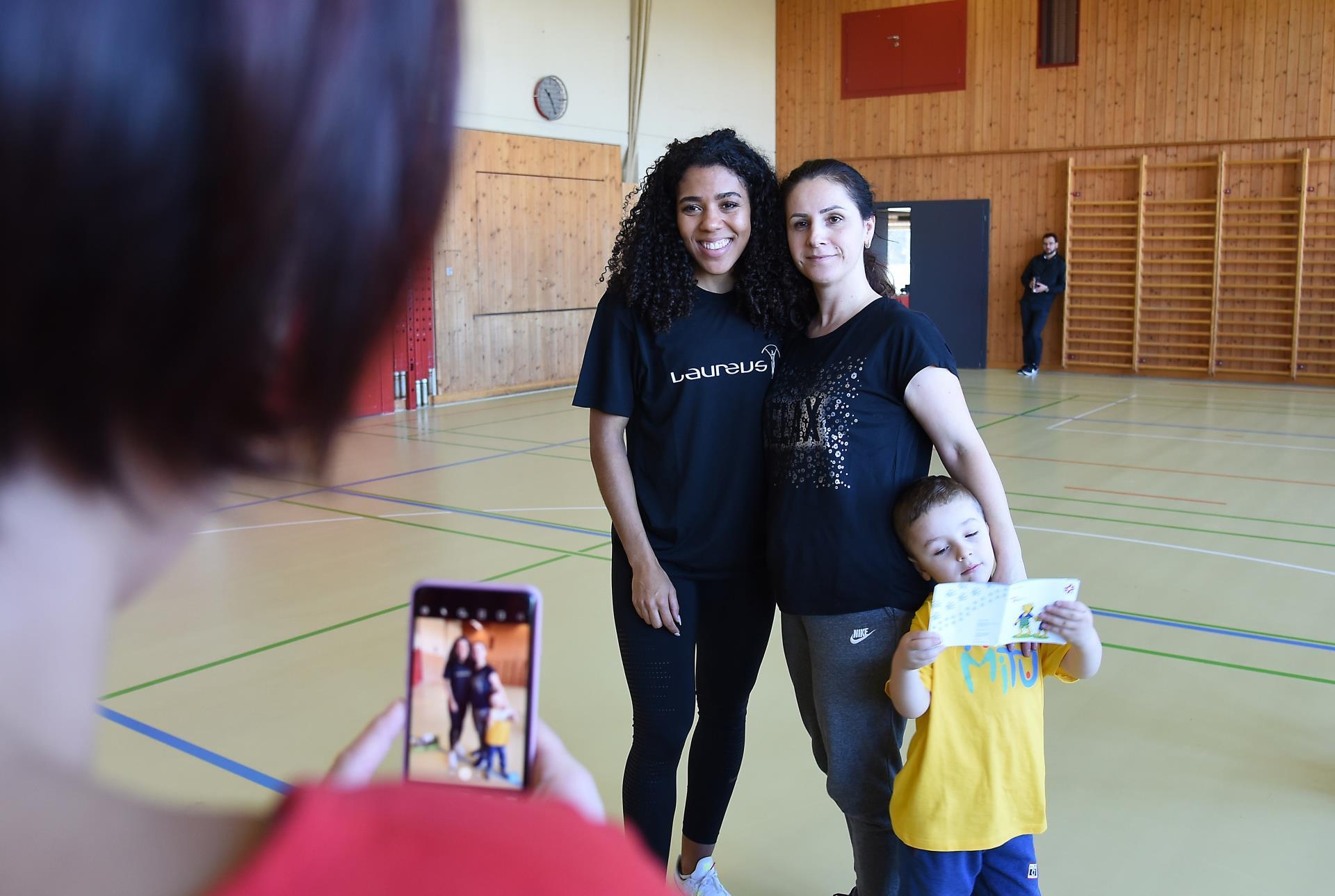 Natürlich wussten die sehr jungen Kinder nicht ganz, wer sie besuchte. Dennoch merkten sie schnell, dass ihr Gast besonders ist. Während der Turnlektionen – einen tollen Parcours durften sie absolvieren – wurden sie immer wieder fotografiert und gefilmt. Auch durften alle 13 Kinder mit Mamis und einem Papi ein gemeinsames Foto mit Mujinga Kambundji machen. Auch sprinteten sie am Schluss zusammen der Spitzensportlerin auf einer kurzen Strecke um die Wette.