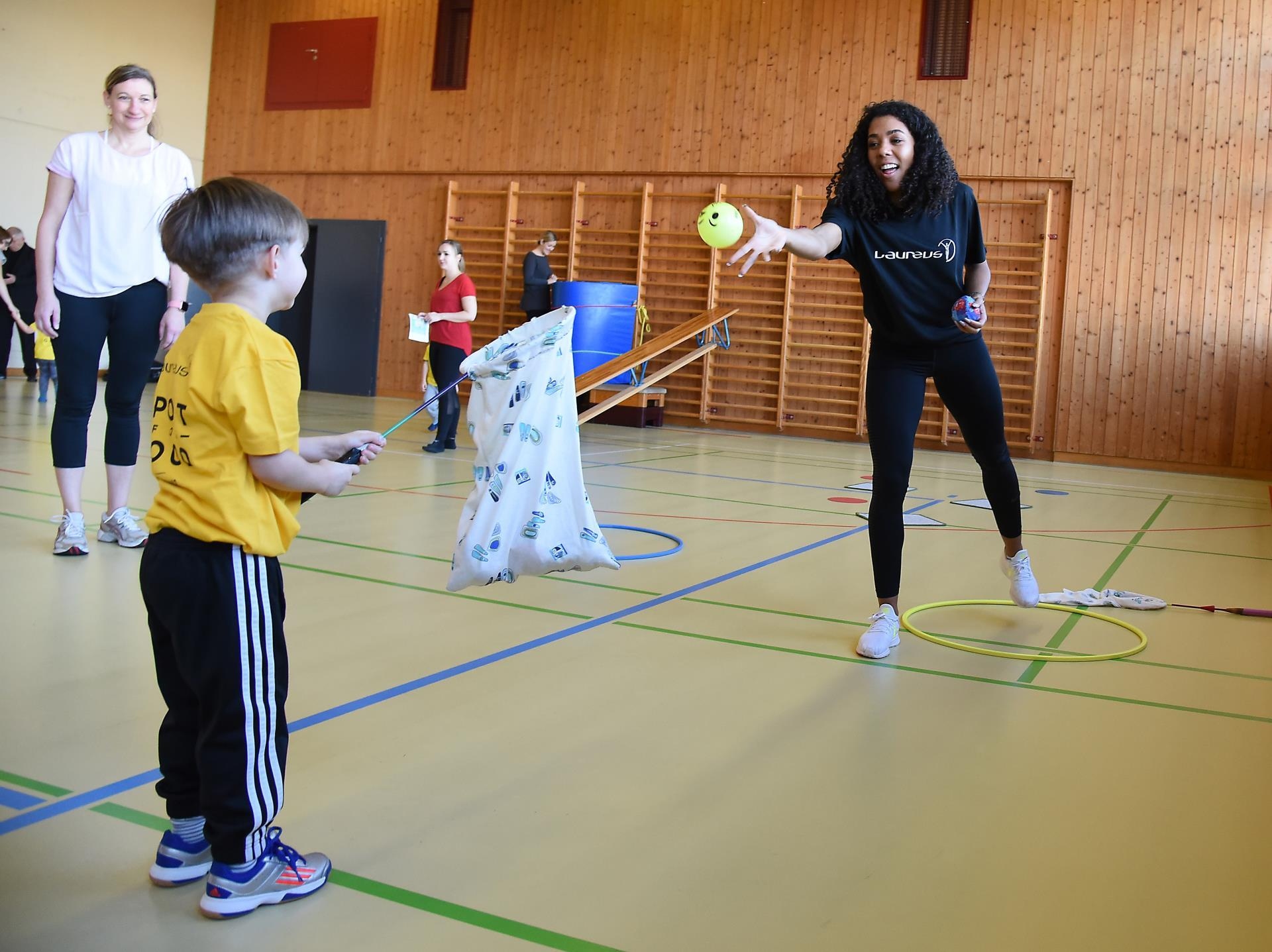 Sportlerin des Jahres 2019 ist Mujinga Kambundji und gewann vergangenes Jahr Bronze über 200 Meter an der WM. Sie überzeugt mit ihrer herzlichen Art, wie am Donnerstagmorgen ersichtlich wurde. Beim Projekt MiTu «Miteinander Turnen» schaute sie ab 9.15 Uhr vorbei und unterstützte Leiterin Astrid Müller sowie Mamis und Papis.