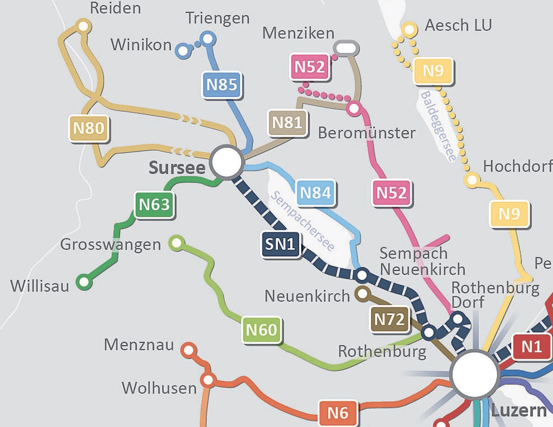 Mitte Dezember nimmt das neue öV-Nachtnetz den Betrieb auf. Zwischen Luzern und Sursee verkehrt stündlich die Nacht-S-Bahn SN1 mit Anschluss auf…