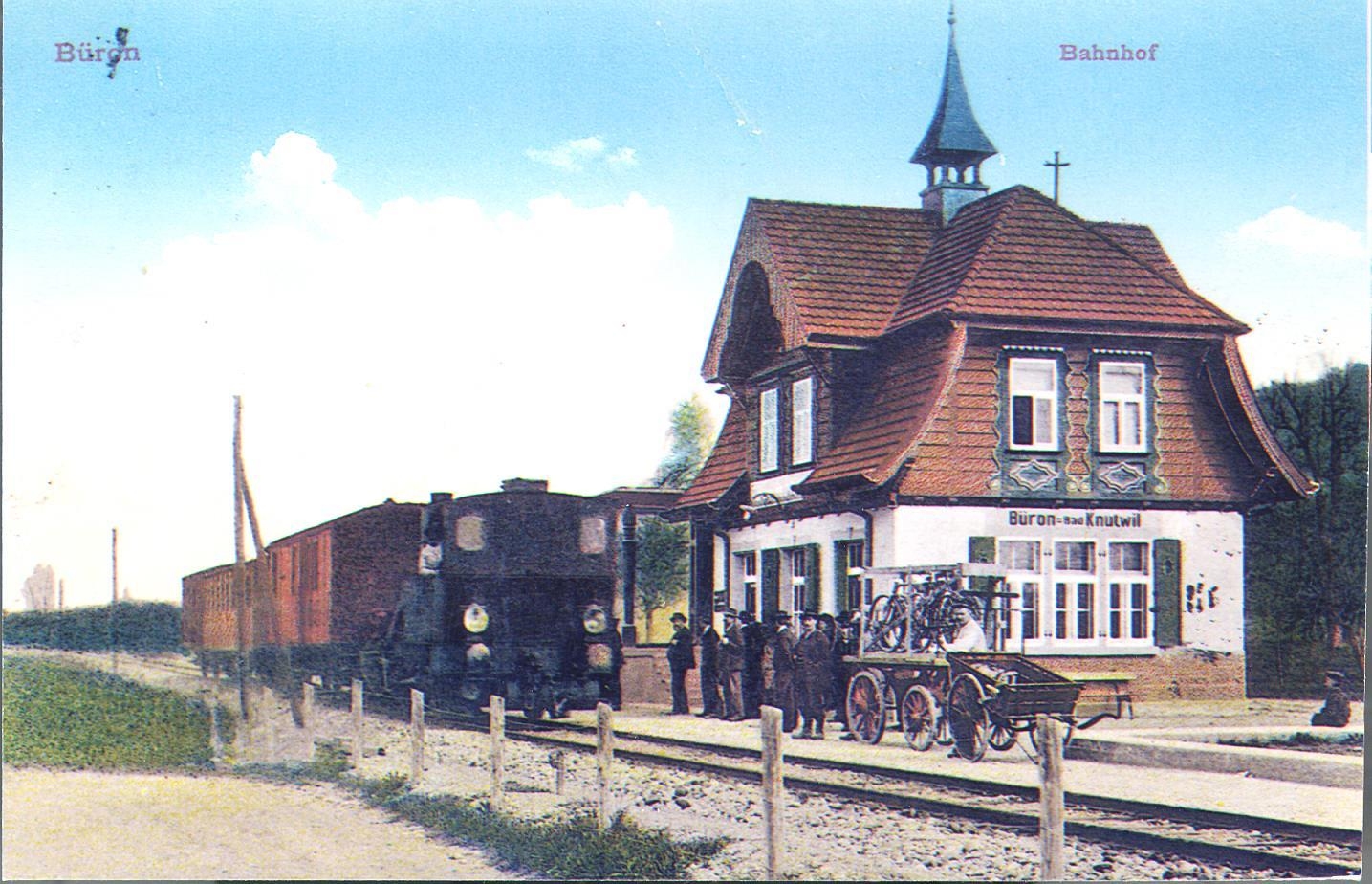 Diese 105 Jahre alte kolorierte Postkarte des Bahnhofs Büron-Bad Knutwil der Sursee–Triengen-Bahn (ST) hat gleich in mehrfacher Hinsicht…