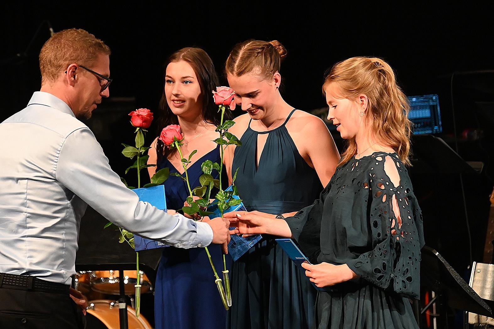 Dann kam der grosse Moment: Die Maturae und Maturi wurden vom Rektor nach vorne gebeten. Auf der Bühne überreichten ihnen die Klassenlehrerin Rahel Korthus sowie die Klassenlehrer Renato D'Incau und Raffael Fischer das Maturitätszeugnis und eine Rose. Die Feier wurde von der Bigband der Kantonsschule Sursee unter der Leitung von Roland Callmar und Raphael Staub musikalisch umrahmt.