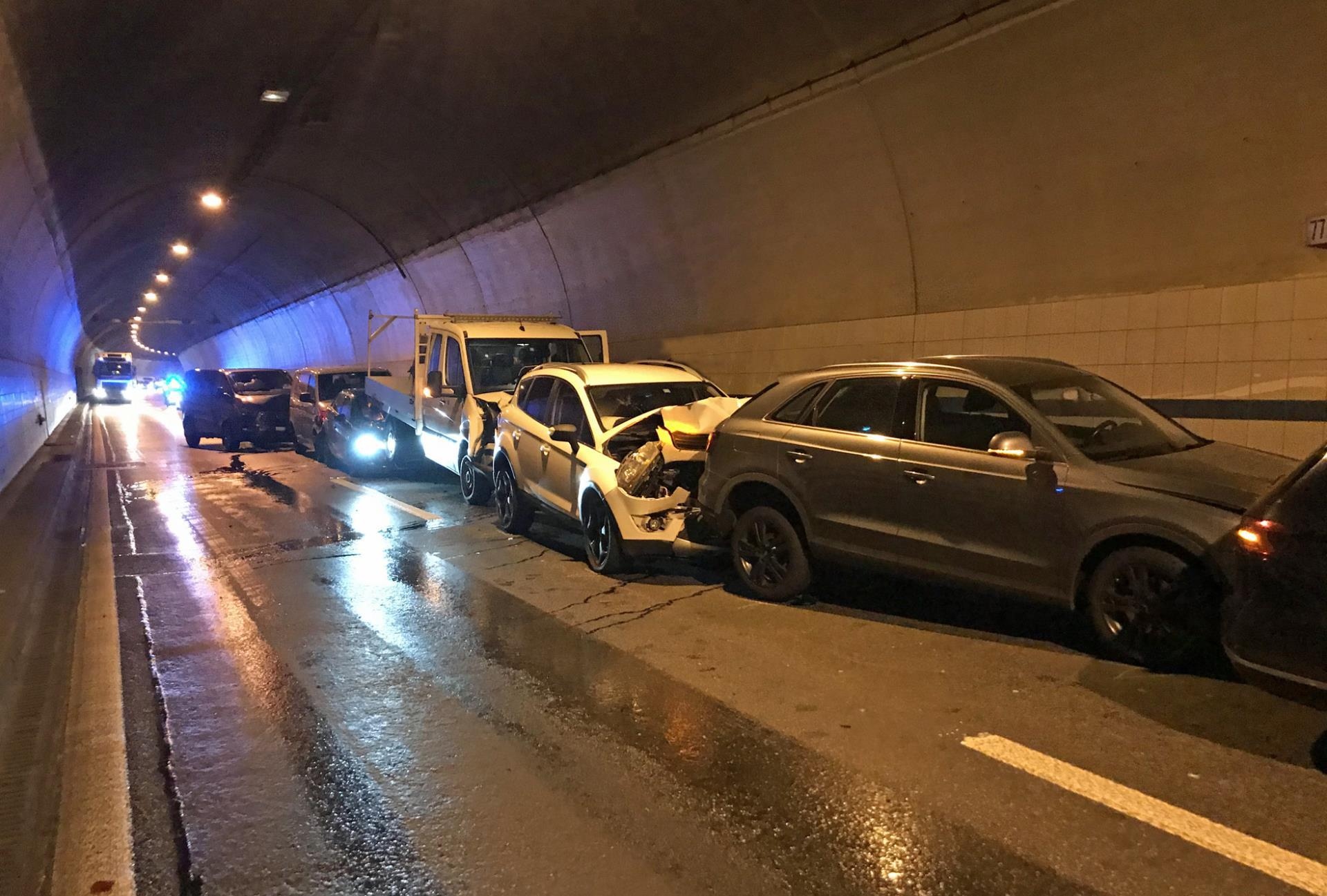 Am Freitag, kurz nach 6.30 Uhr, fuhr ein Autofahrer auf der Autobahn A2 auf dem Überholstreifen in Richtung Norden. Im Tunnel Eich kam der Verkehrsfluss aus noch unbekannten Gründen ins Stocken, weshalb der Autofahrer sein Auto bis zum Stillstand abbremsen musste. In der Folge ereigneten sich mehrere Auffahrkollisionen, in welche elf Fahrzeuge verwickelt waren. Der Unfallhergang ist Gegenstand der weiteren Abklärungen und Einvernahmen.