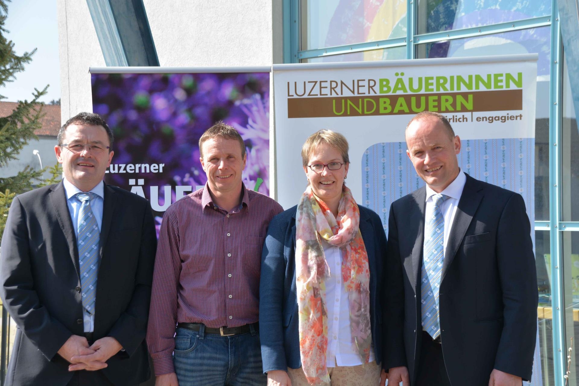 Am Freitag haben die Delegierten des Luzerner Bäuerinnen- und Bauernverband Ruedi Stofer (2.v.l.) aus Wilihof in den Vorstand gewählt. Auch gewählt wurde Hella Schnider, Flühli. Die Bauern wehrten sich in Gelfingen gegen das Hochwasserprojekt an der Reuss. Präsident Jakob Lütolf kündigte an, diesbezüglich national aktiv zu werden.