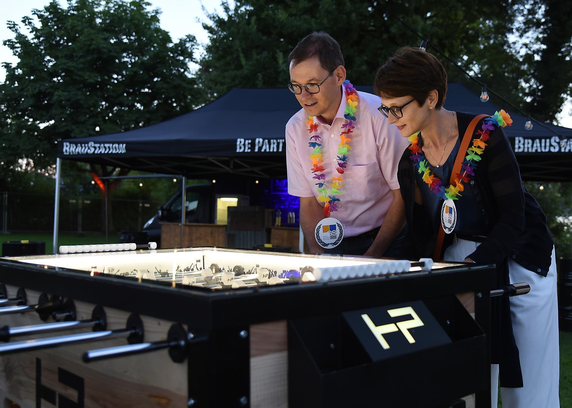 Zum Auftakt des Jubiläumsabend erhielten alle Gewerbler eine bunte Kette à la Hawaii mit der Aufschrift «1999 - 2019. 20 Jahre vernetzt». Präsident Urs Schocher blickte in die Vergangenheit und erwähnte, dass am Anfang des Vereins eine Gewerbeausstellung gestanden sei. «Eigentlich hätte Heiri Estermann erster Präsident werden sollen, aber er wurde zum Nationalrat gewählt und hatte keine Zeit mehr.» So übernahm der später viel zu früh verstorbene Robert Kaufmann das Präsidium.