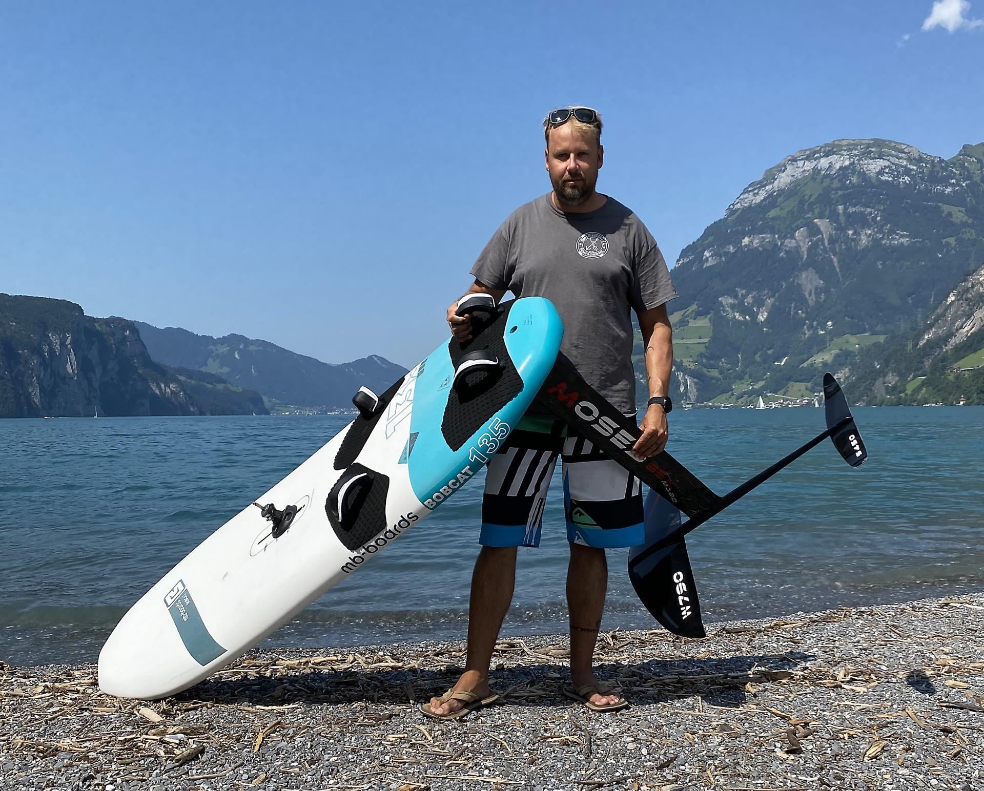 Der 45-jährige Surseer erklärt den Ablauf beim Start: «Ich steige mit dem Brett, dem Segel und dem Mast ins Wasser. Dann stehe ich auf das Brett, reisse drei- bis viermal am Segel und pumpe mit dem Brett.»
