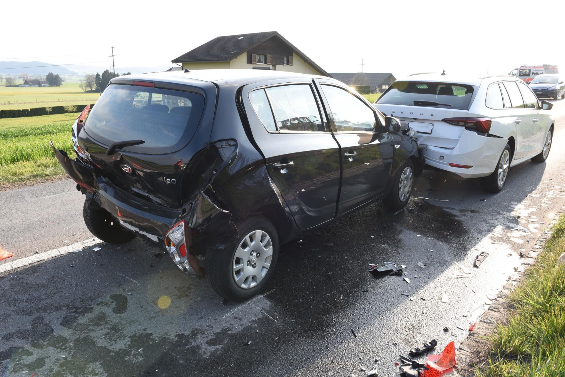 Am Donnerstag, 22. April, kurz vor 17 Uhr, fuhr ein Autofahrer von St. Erhard in Richtung Wauwil. Beim Dorfausgang von Kaltbach löste sich – mutmasslich aufgrund von landwirtschaftlichen Arbeiten auf dem naheliegenden Acker – ein Stein, der dem Autofahrer vors Auto rollte und sich unter der Frontschürze verkeilte. Der Autofahrer bremste sein Fahrzeug bis zum Stillstand ab. Zwei nachfolgende Autos konnten rechtzeitig abbremsen, ein drittes Fahrzeug prallte jedoch trotz Vollbremsung ins Vorderauto, das wiederum in das vor ihm stehende Fahrzeug geschoben wurde.