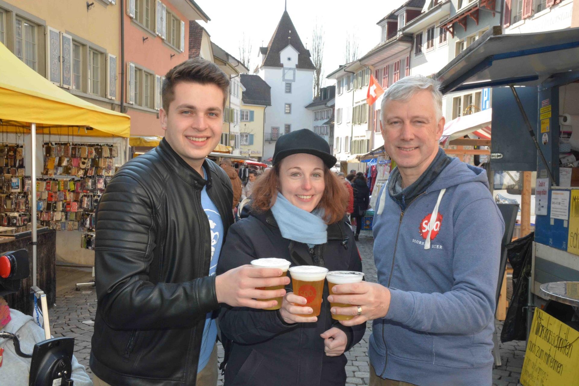 Ein Prost auf den Frühling. Am Ostermärt in Sursee war der Frühling in den Gesichtern der vielen Besucherinnen und Besucher zu sehen. Fröhlich, entspannt und mit einem Lächeln konnten sie die vielen Stände bewundern, da und dort Bekannte treffen, über den langen Winter lästern, die Sonne loben und zusammen "eis näh". Wie das Mario Cozzio, Karin Wagemann und Herbert Blum (von links) vor dem Untertor getan haben. Weitere Bilder unter Bilderstrecke.
