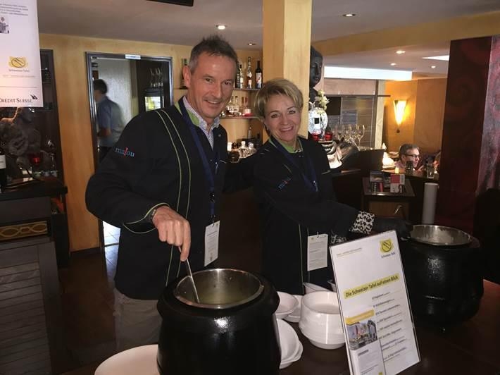 Jedes Jahr scheinen mehr Leute den Surseer Suppentag zu unterstützen. Im "Malou" haben am Donnerstagmittag rund 280 Personen Tom Kha Gai und Gemüsesuppe gelöffelt. 4243,40 Franken spendeten sie der Schweizer Tafel. In diesem Jahr halfen (im Bild) Andreas Birrer, Präsident Gewerbe Region Sursee, und Inge Lichtsteiner, CVP-Kantonsrätin und Verlagsleiterin der Surseer Woche AG, beim Schöpfen.