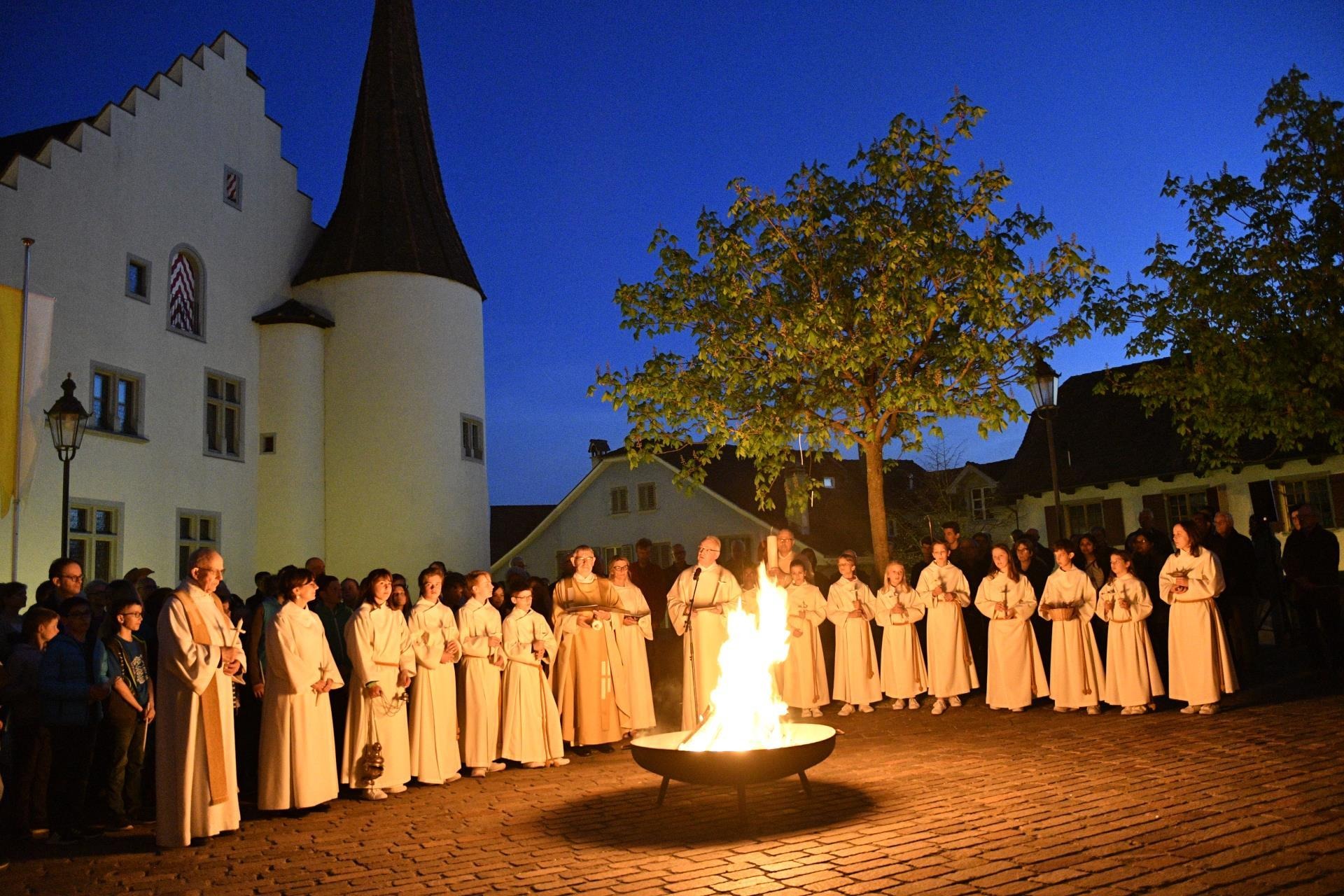 Es war ein besinnlicher Moment, als sich die Besucherinnen und Besucher am Karsamstagabend auf dem Kirchenplatz um das Osterfeuer versammelten. Nachdem die Osterkerze entzündet war, wurde das Osterlicht in die dunkle Kirche getragen und in Andenken an die Auferstehung Jesu den Anwesenden weitergereicht. «Dieses Osterlicht wird uns ein Jahr lang in Momenten der Freude und des Leides begleiten», meinte Pfarreileiter Claudio Tomassini in der Predigt zur Osternacht. Die Freude war auch der jungen Familie Tschudi anzusehen, als Claudio Tomassini während der Messe ihren Sohn Martin taufte.