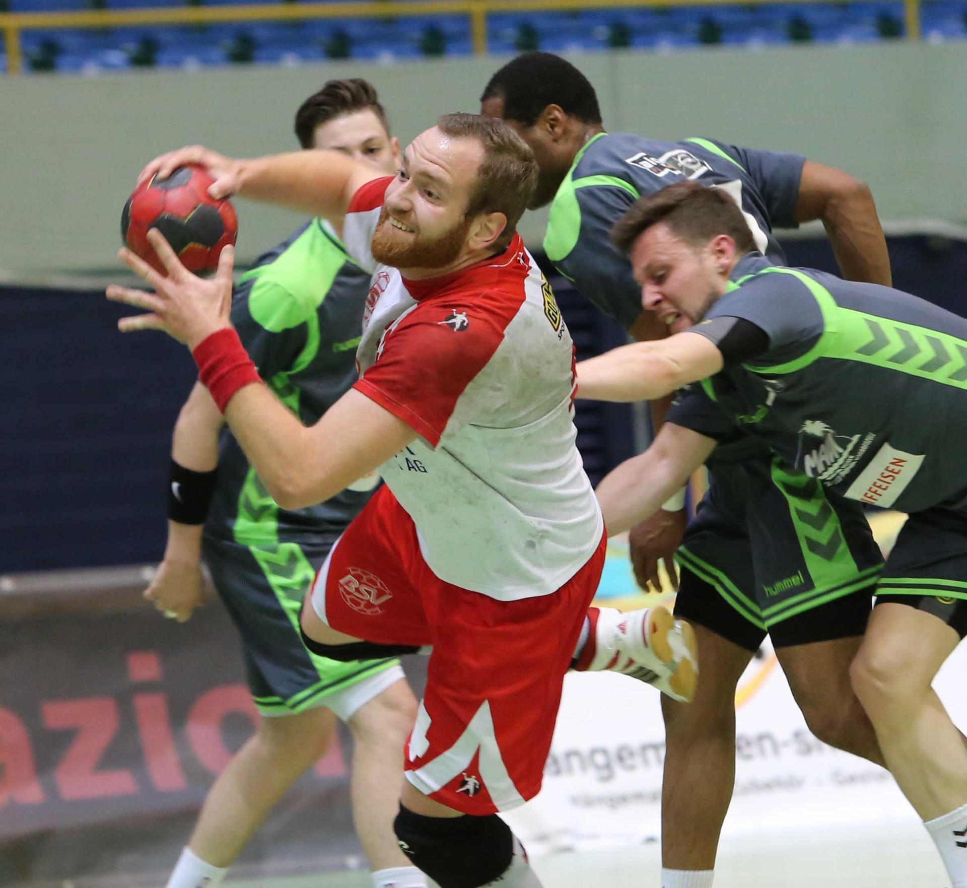 Der BSV Rot-Weiss Sursee schafft die Sensation. In der 1. Hauptrunde des Schweizer Cups schlägt er am Dienstagabend den SC Frauenfeld aus der 1. Liga mit 21:17 (10:9). Einen grossen Anteil am Sieg darf Torhüter Zlatan Bratanovic in der Stadthalle für sich in Anspruch nehmen. Er hext vor 140 Zuschauern, 15 Paraden gelingen ihm. Im Bild Christoph Angehrn.