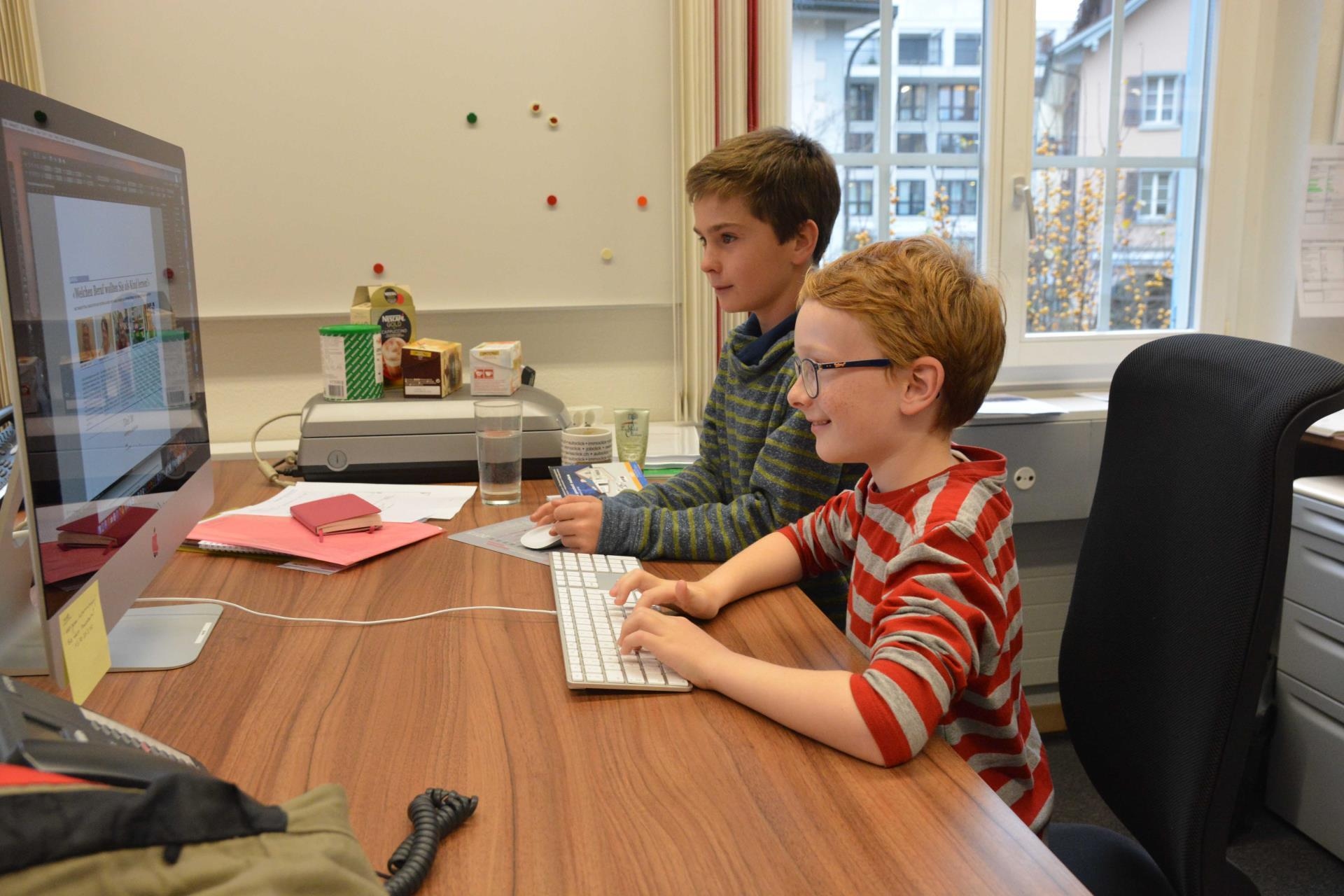 Am nationalen Zukunftstag vom Donnerstag beteiligte sich auch die Surseer Woche AG. So erfuhren Pascal Henzer und Severin Graber (von links) aus erster Hand, wie eine Zeitung entsteht. Ausserdem begleiteten sie Mitarbeiter der Inserateabteilung bei Kundenbesuchen. Die beiden Buben zeigten sich beeindruckt vom Blick hinter die Kulissen.