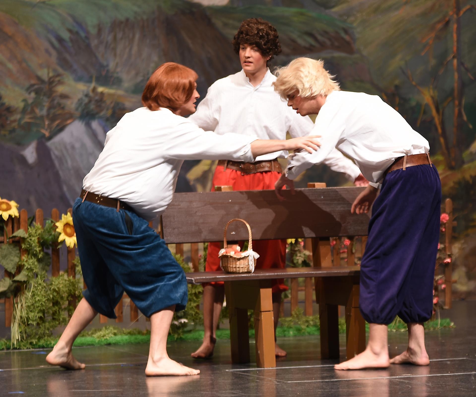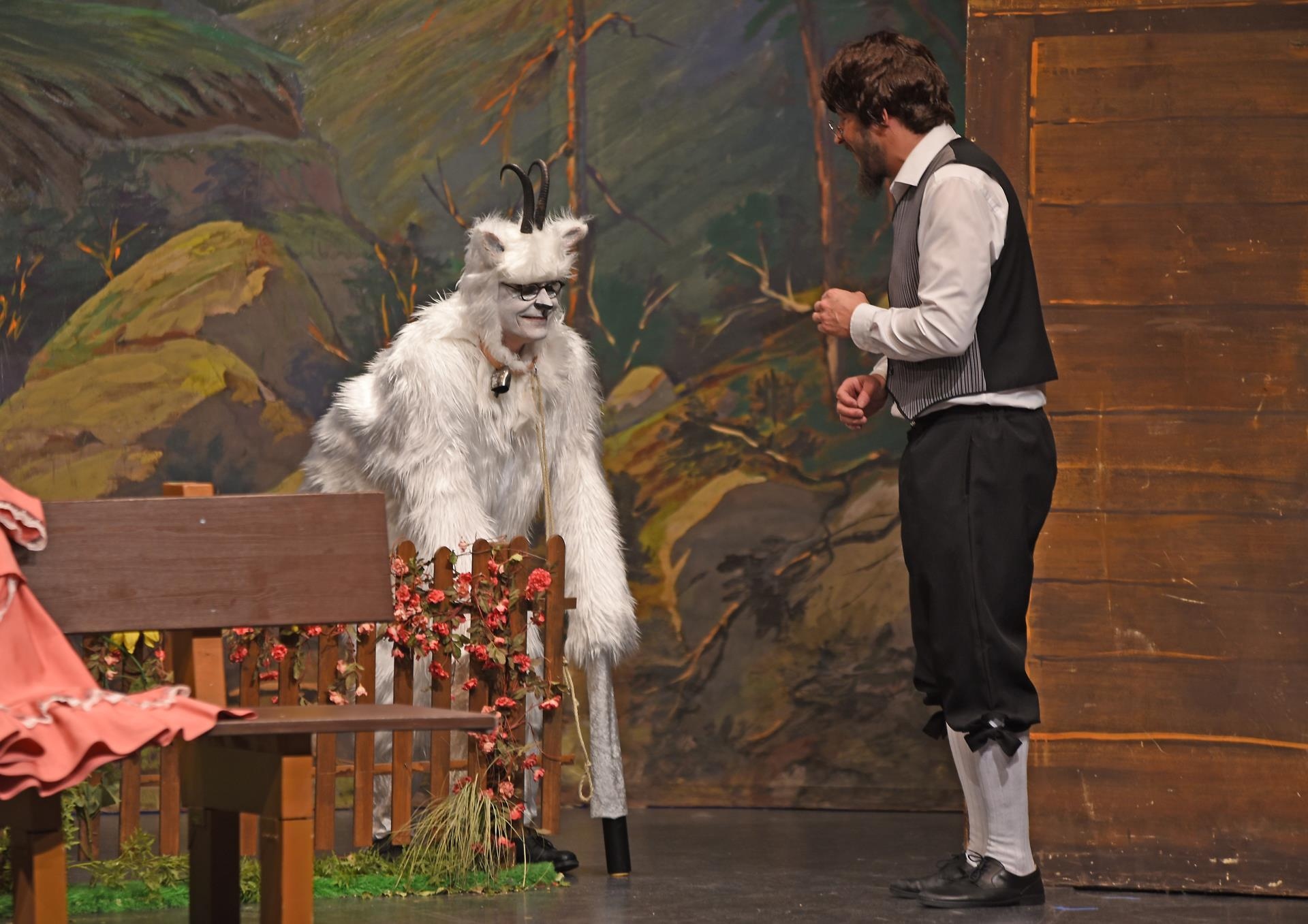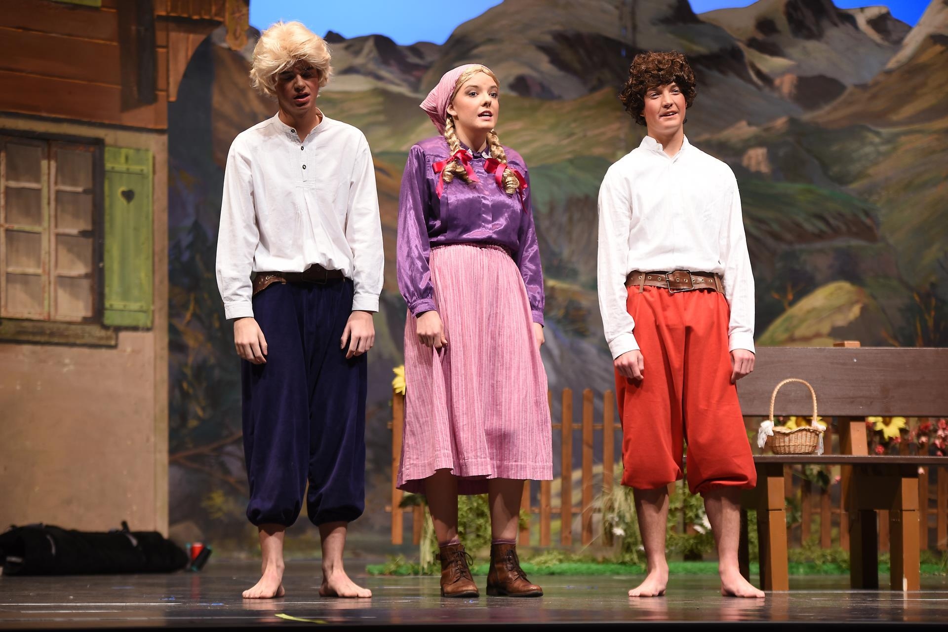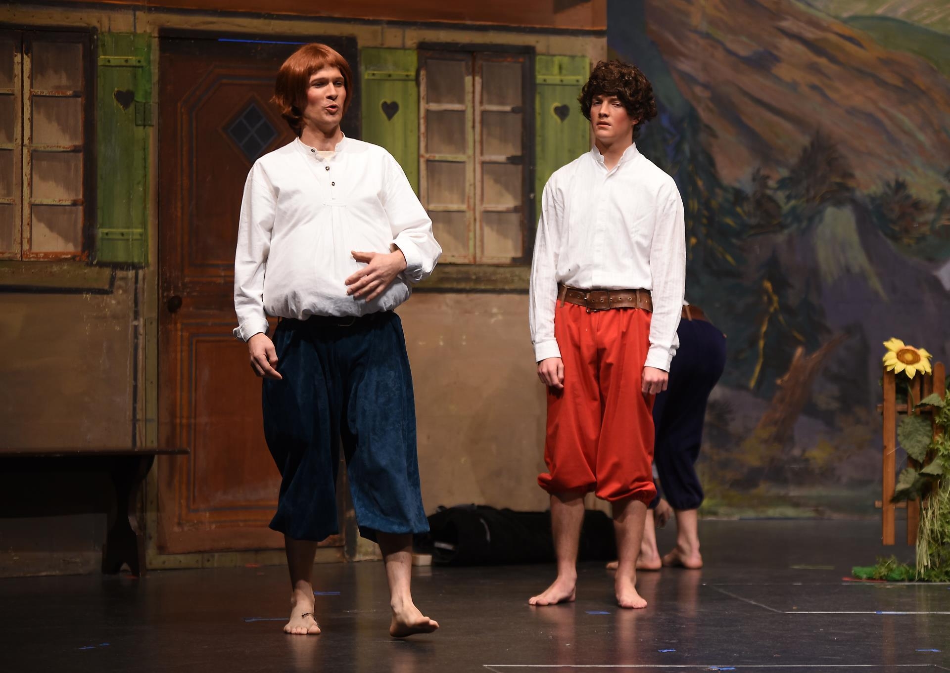 Schneidermeister Nädeli (Nico Negri) und Rägeli (Lin Arnold) treten zuerst auf die Bühne. Sie sprechen über die gesammelten Erdbeeren. Die drei Brüder Fritz (Pascal Küng), Franz (Daniel Heggendorn) und Florian (Jan Lauber) hören mit und stibitzen die süssen Früchte. Auf der Bühne singen Rägeli, Franz und Florian «Det äne am Bärgli, det stoht ä wysi Geiss». Alle im Forum Triengen singen mit. Frau Bohnenbluest (Ursula Koch) taucht ebenfalls erstmals auf.