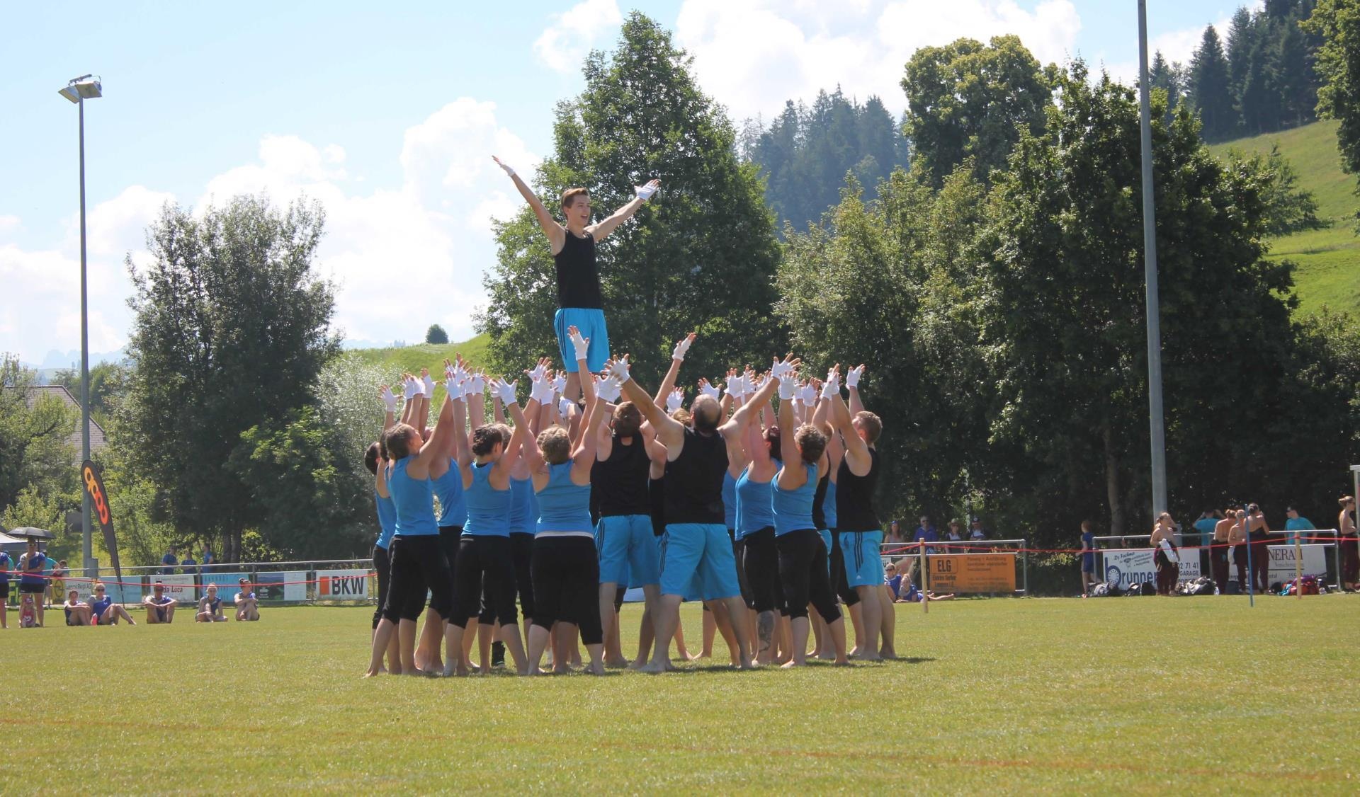 Weiter ging es im zweiten Wettkampfteil mit Team Aerobic und Barren. Die 21 top motivierten Team Aerobic Frauen strahlten mit der Sonne um die Wette und wurden mit der Note 8.50 belohnt. In der Ilfishalle, wo normalerweise die SCL Tigers auf Ihren Kufen schleifen, haben nun die Barrenturner ihr geschliffenes Programm zum Besten gegeben. Die Note von 9.23 lässt sich sehen. Als letztes starteten das Schaukelringteam, die Schulstufenbarrenturnerinnen sowie die Steinheber. Trotz knapper Aufstell- und Einturnphase konnten die Schaukelringturner- und Turnerinnen mit einigen eingeschlichenen Fehlern ein guten Abschluss von 9.22 erturnen. Die Turnerinnen am Stufenbarren zeigten, dass sich die harten Trainings gelohnt haben. Um mehr als eine ganze Note konnten sie sich seit Hochdorf auf ein 8.98 steigern. Die Steinheber gingen kein Risiko mehr ein und hoben sich zu einer sicheren 9.40.