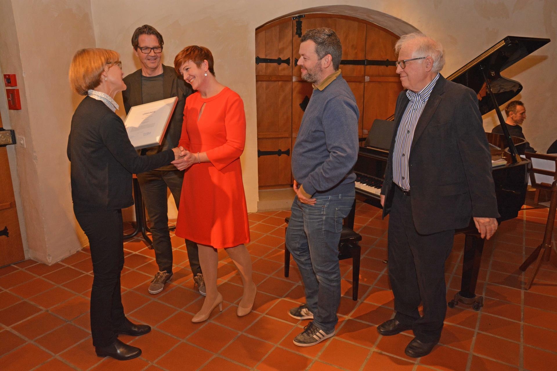 Bildungsvorsteherin Heidi Schilliger oblag es, die Ehrenurkunde an die vier Mitglieder des Vereins Kulturprodukte Sursee, Ursula Koller, Kurt Heimann, Tom Giger und Stefan Bättig, zu überreichen. Im Abschluss daran liess es sich Reto Bernhard nicht nehmen, den Koordinator Tom Giger mit ein paar Fragen zu löchern. So verriet Giger etwa, dass man gerne einmal Carla Del Ponte einladen würde. Eine der wesentlichsten Herausforderungen erblickt er darin, bei der Programmgestaltung breit zu sein – allerdings ohne alles machen zu wollen. Digitalisierung sei wichtig, liess er weiter durchblicken, «aber man muss es auch analog richtig machen». Was denn nun mit dem Preisgeld geschehe, wollte der Laudator vom Koordinator weiter wissen. Dieser versprach, es so einzusetzen, dass es dem Publikum zugute komme. Zum Schluss versuchte Reto Bernhard Tom Giger mit der Frage aufs Glatteis zu führen, ob und warum der Verein schon mal an Grenzen gestossen sei. Der Koordinator war jedoch um die Antwort nicht verlegen: «Immer wieder gilt es die Ungewissheit auszuhalten, ob eine Veranstaltung auch wirklich in Fahrt kommen würde. Aber es gehört einfach dazu, immer etwas auszuprobieren, von dem man nicht weiss, ob es erfolgreich ist.»