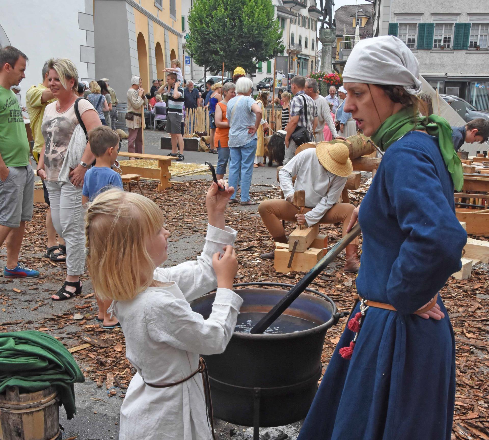 Eine kleine Mittelalter-Szenerie zwischen Stiftstheater und Schmitte im oberen Flecken von Münster zog am Samstagnachmittag viel einheimisches und auswärtiges Publikum an. Hühner-Marktfrauen, Schmied und Korbflechter und Lederwarenhändler – sie und viele weitere Mittelalter halfen Klein und Gross beim Geschichte be-greifen.