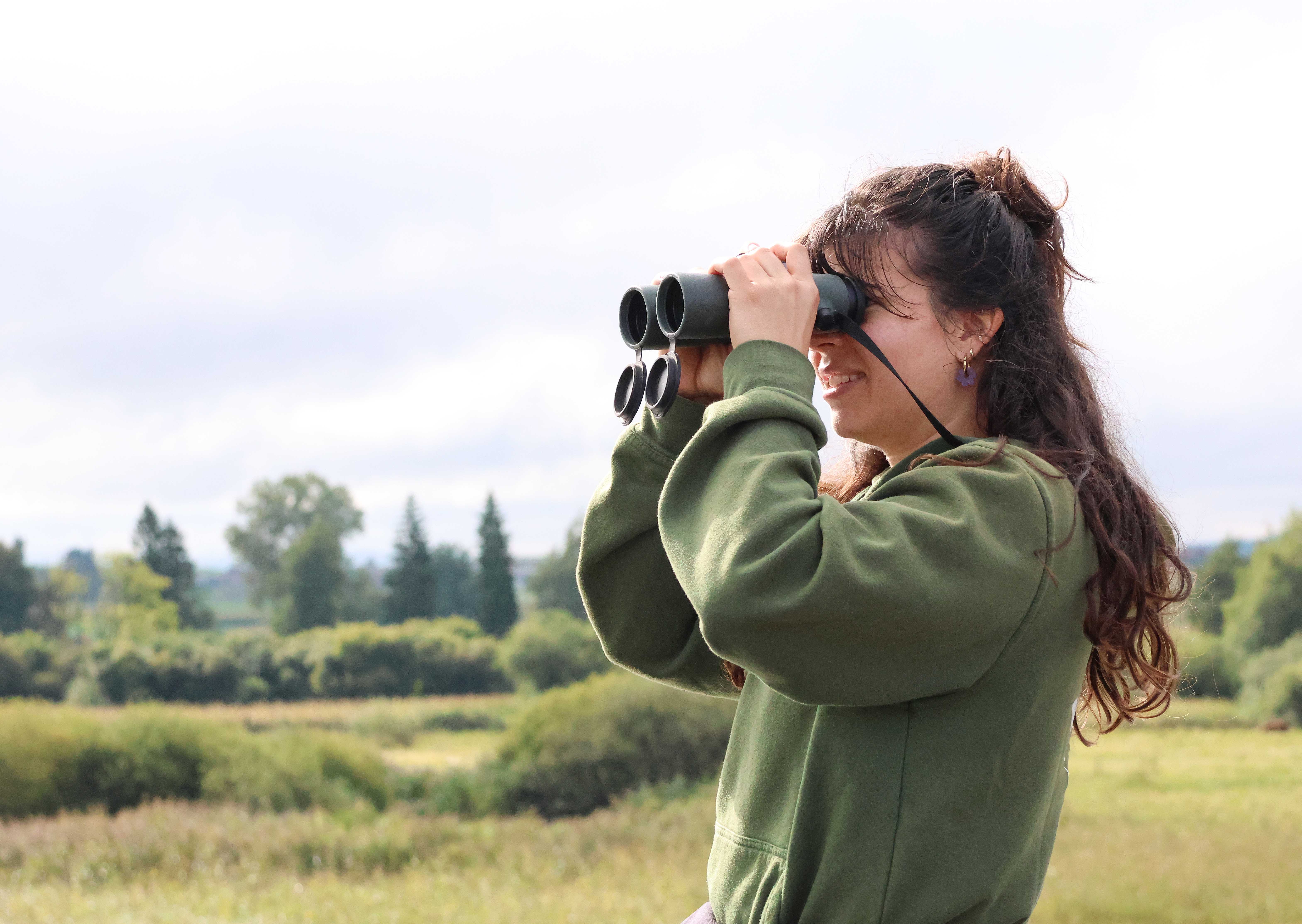 Erfahrene Ornithologinnen tragen den Feldstecher nahe bei sich, um ihn schnell zücken zu können, wenn ein Vogel vorbeifliegt.