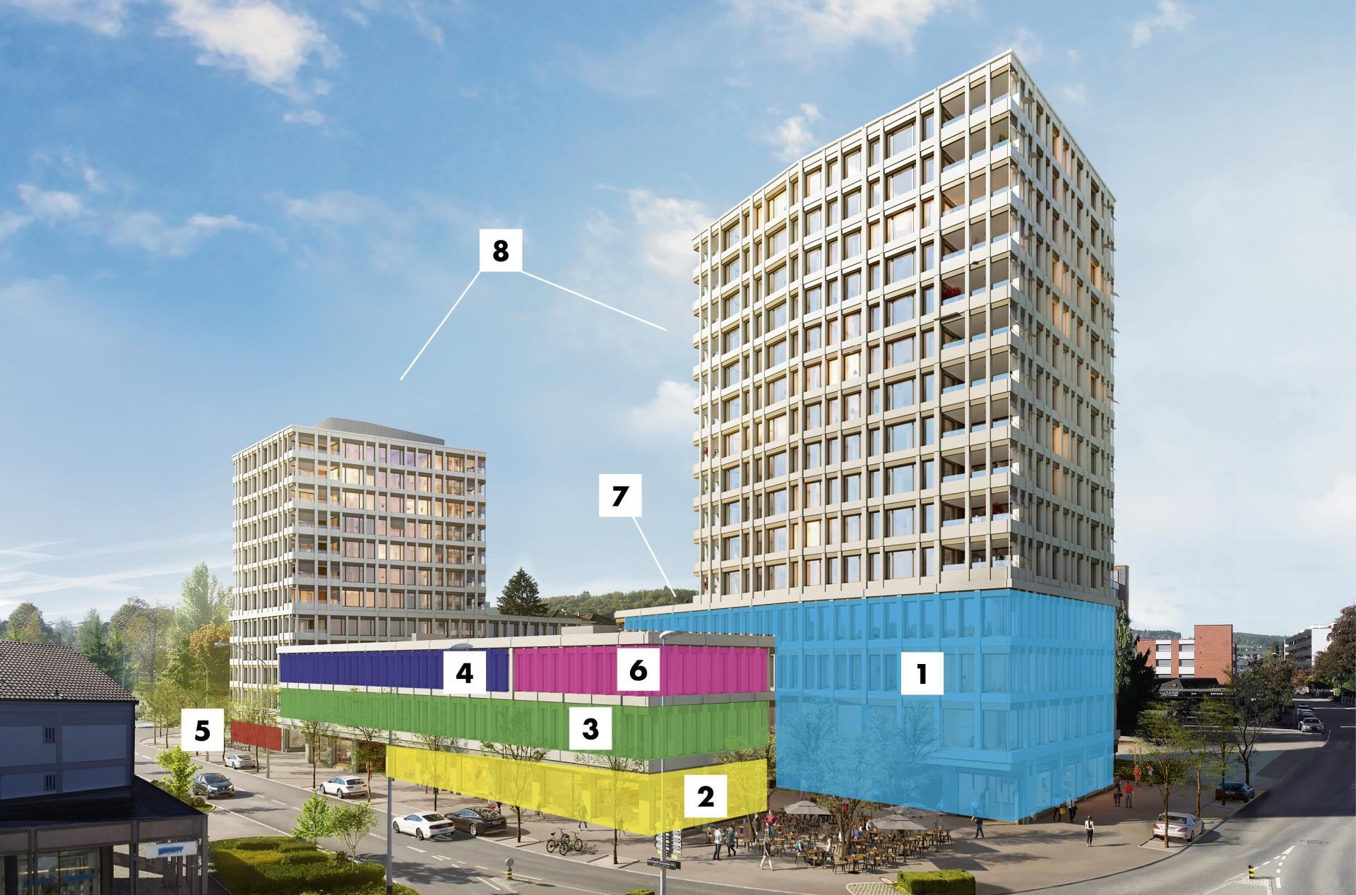 Die beiden Hochhäuser und der Längsbau entlang der Christoph-Schnyder-Strasse beherbergen total 91 Eigentumswohnungen und 2700 Quadratmeter Gewerbefläche. Häfliger freut sich, dass anderthalb Jahre vor dem Bezugstermin nur noch wenige Quadratmeter zu vermieten sind: «Uns ist es gelungen, einen ausgewogenen Mietermix mit verschiedenen Frequenzbringern in den ‘Dreiklang’ zu holen.»