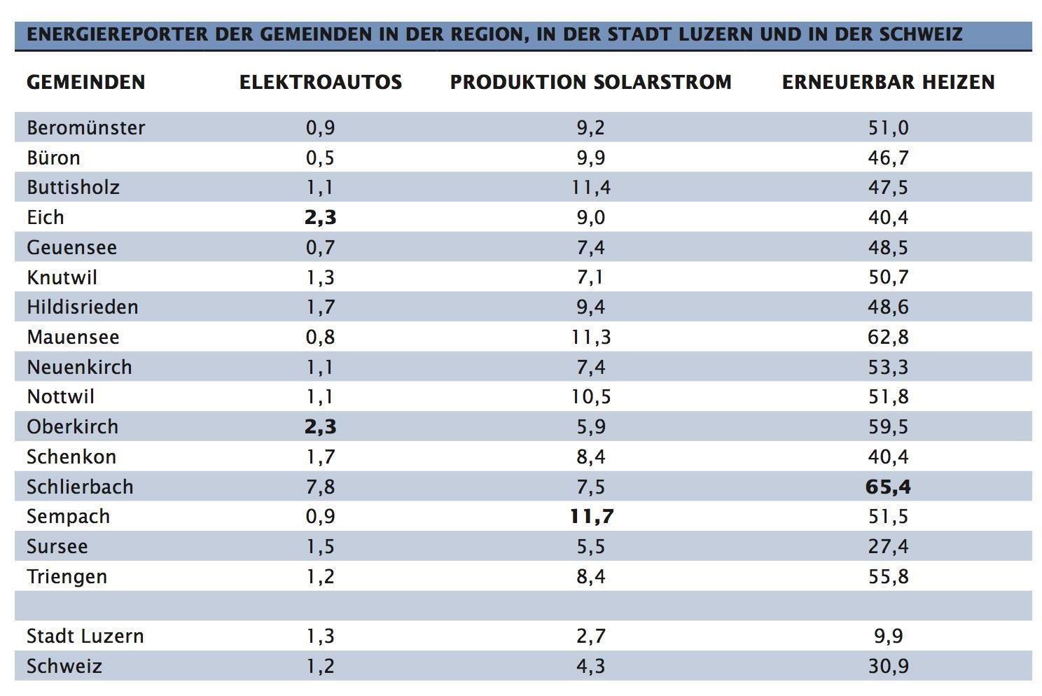 Oberkirch und Eich elektrisch In der Region platzieren sich Oberkirch und Eich bei der Elektromobilität mit je 2,3 Prozent an der Spitze. Die Stadt Sempach hat mit 11,7 Prozent den höchsten Wert bei der Produktion von Solarstrom. Schlierbach schafft Platz 1 beim erneuerbar Heizen.