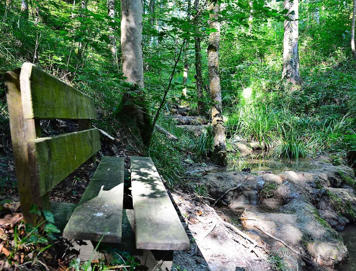 Ein Bänklein steht im Walde ganz still und stumm. Ruhesuchende müssen sich ihren Platz darauf aber zuerst verdienen. Am Fusse der Schenkoner Lehnstrasse führt der Weg tief hinein in den Chäseriwald, ein steiler Aufstieg, der nicht nur bei ungeübten Wanderern das Herz höher schlagen lässt. Vorbei am Weiher weist ein Holzpfeil kurz vor der Jägerhütte «zum Bröggli», und gleich danach lockt er, der Logenplatz am Greuelbach. Umgeben von Bäumen und Sträuchern bahnt sich in aller Ruhe das Wasser seinen Weg, während sich Frösche, Mücken und im Glücksfall sogar Rehe zu dieser idyllischen Kulisse gesellen.