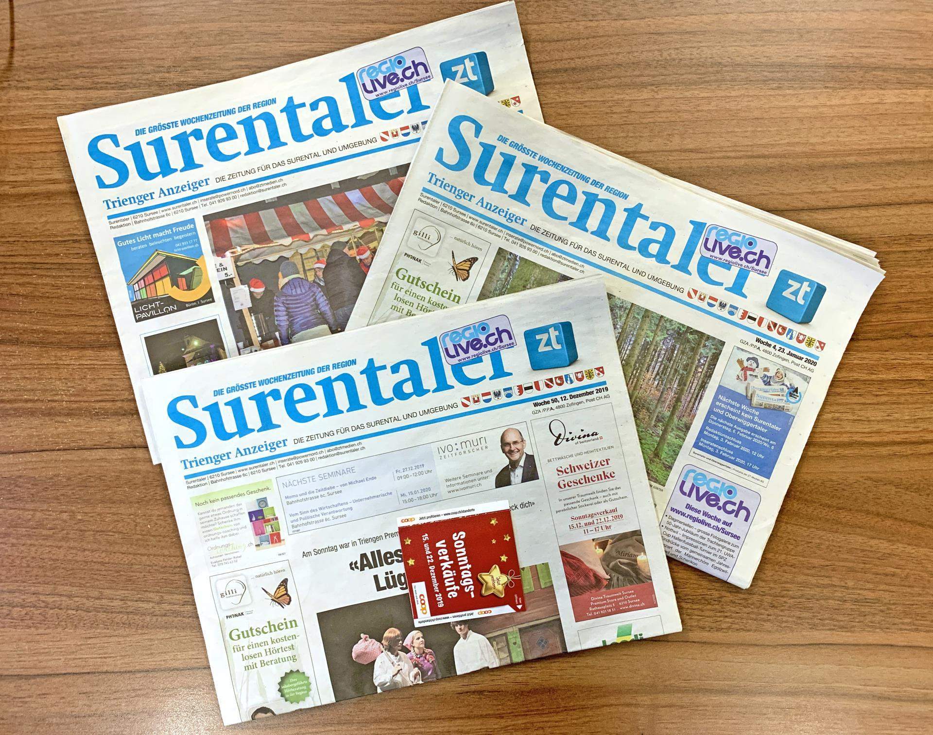 Die Wochenzeitungen Surentaler und Oberwiggertaler werden eingestellt. Laut dem Branchenportal persoenlich.com erscheinen am 27. Februar die letzten Ausgaben. Die ZT Medien hätten sich aus wirtschaftlichen Gründen gezwungen gesehen, die beiden kostenlosen Zeitungen einzustellen und sich aus dem Gebiet zurückzuziehen. Sie deckten 14 Gemeinden im Surental und 19 Gemeinden im Oberwiggertal ab.