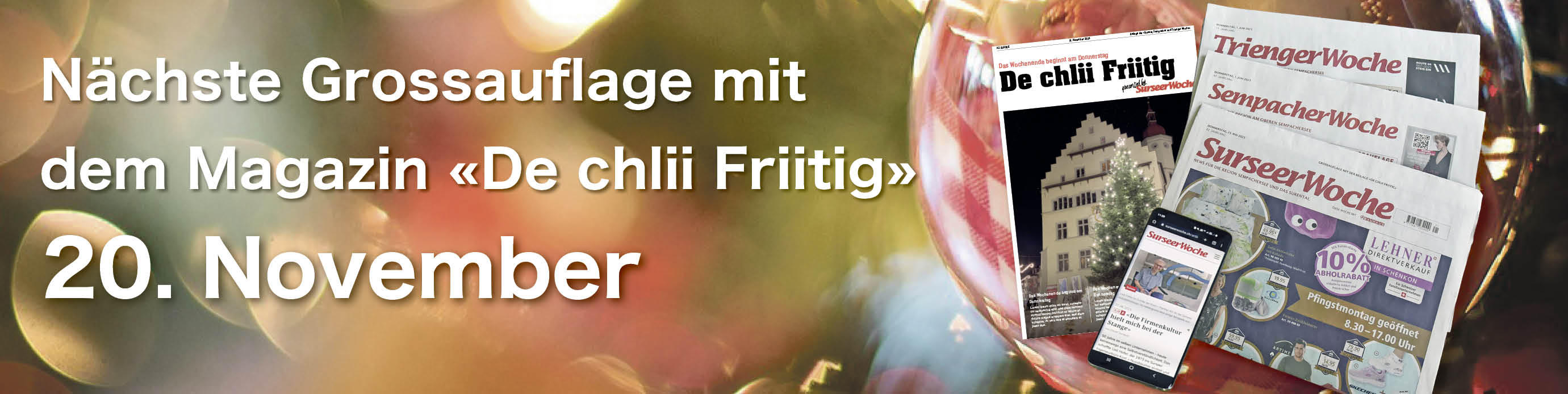 Entdecken Sie winterliche Ausgehtipps, genussvolle Apéros, feine Menüs, stimmungsvolle Events und gemütliche Momente am Feuer. «De chlii Friitig» lädt mit Kultur, Design, Mode, Familie und ganz viel Weihnachtszauber zum Verweilen ein. Ein Inserat lohnt sich – gerade jetzt zur schönsten Zeit des Jahres!